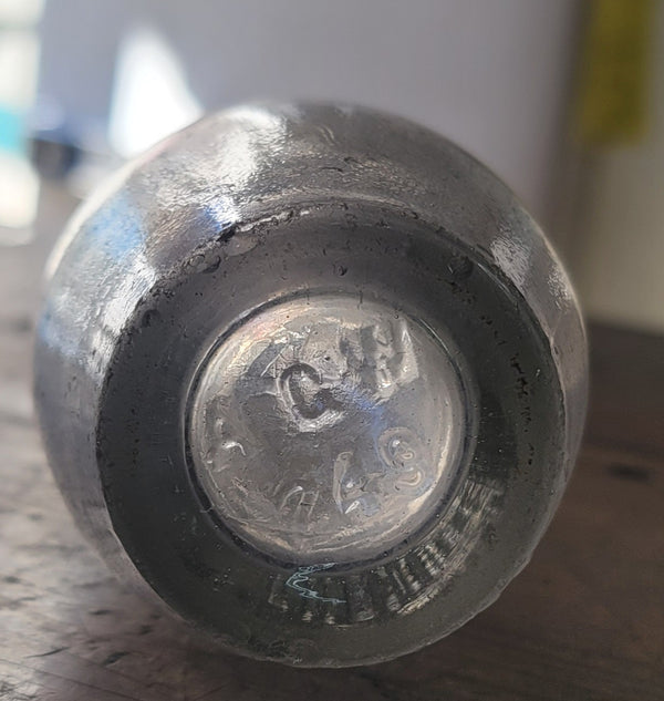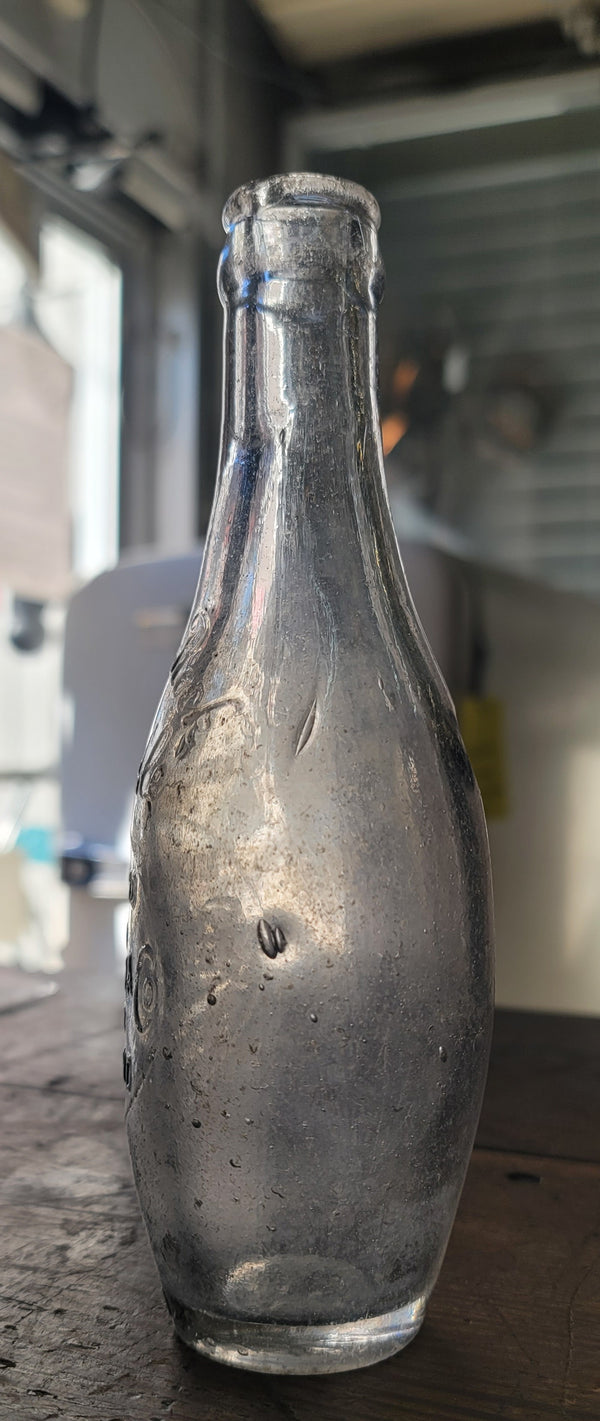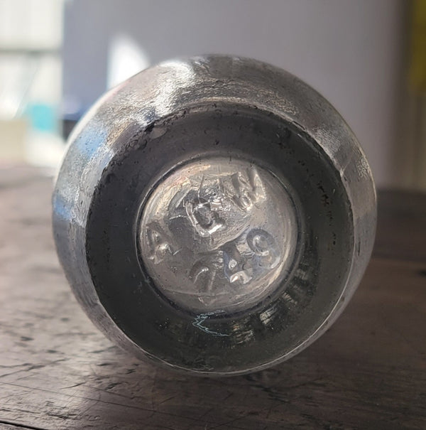 Sometimes called a "ten pin" bottle due to it's resemblance to a bowling pin. There are a number of air bubbles all around the bottle. It does have two chips on the side which are pictured. The bottom edge has more embossing with "7 Fluid Ounces". The very bottom shows the numbers and letters - "A GW" 249.