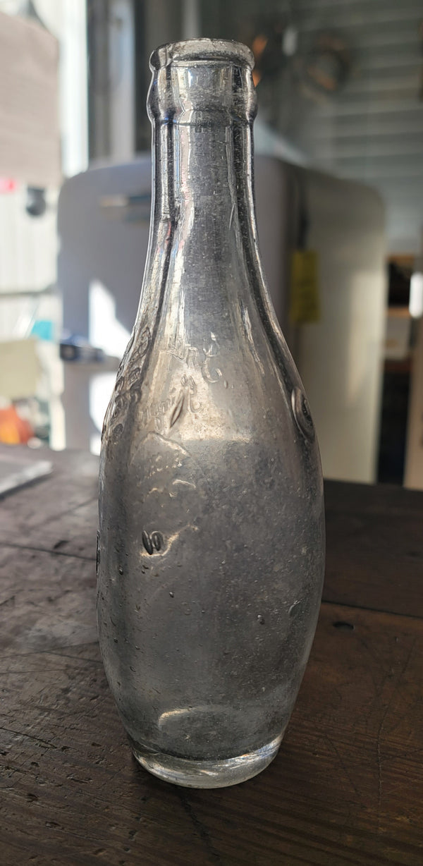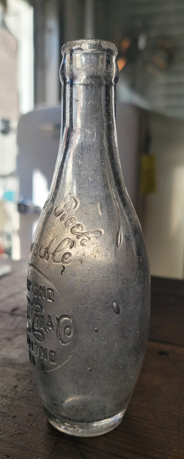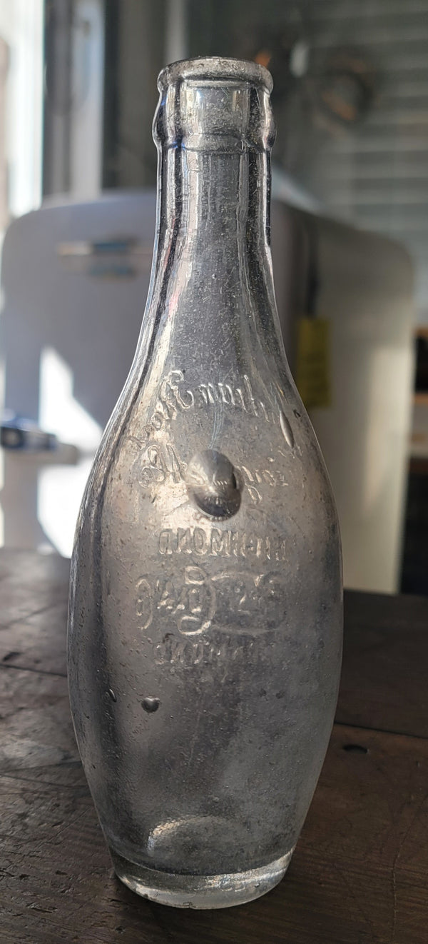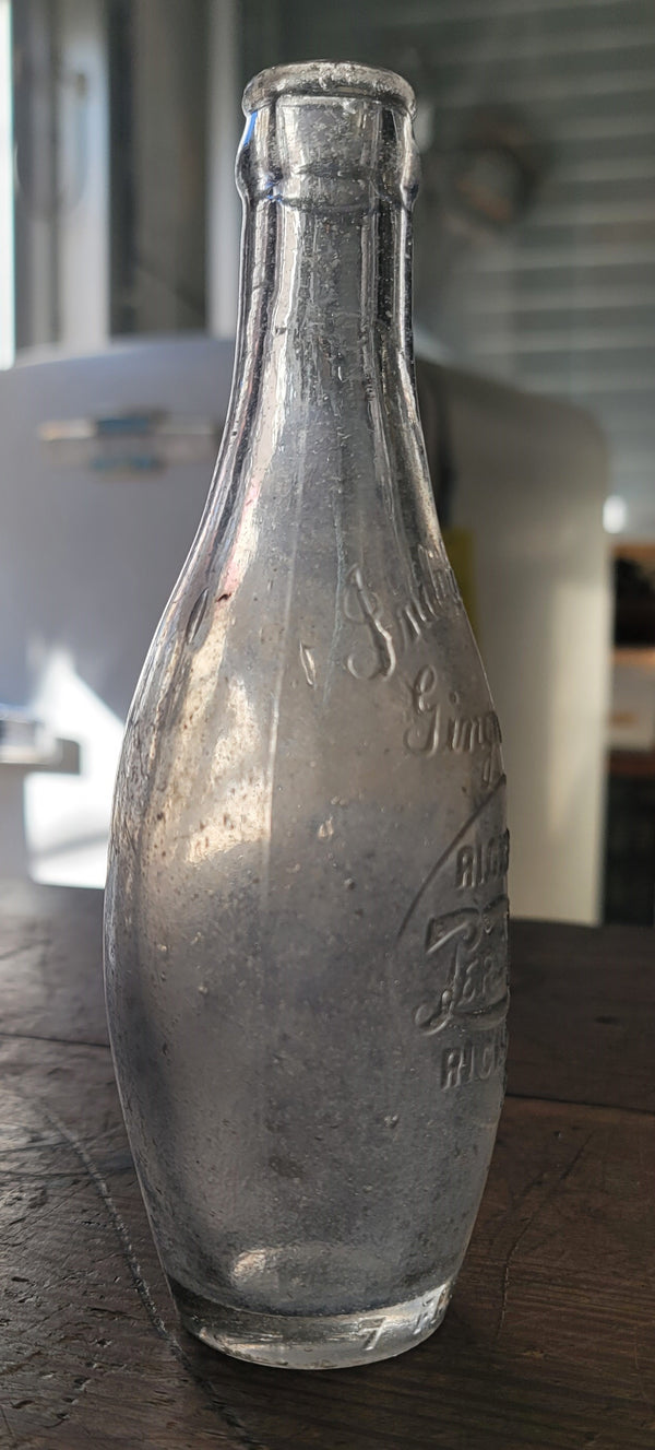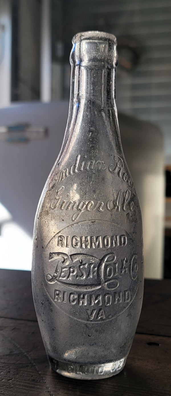 Produced in Richmond, Virginia in the early 1900's, this bottle has both the Indian Rock Ginger Ale embossed in script at the top and double dot Pepsi:Cola (double dot) at the center - with it's provenance of Richmond, VA. This bottle does have a slight amethyst hue and is asymmetrical.