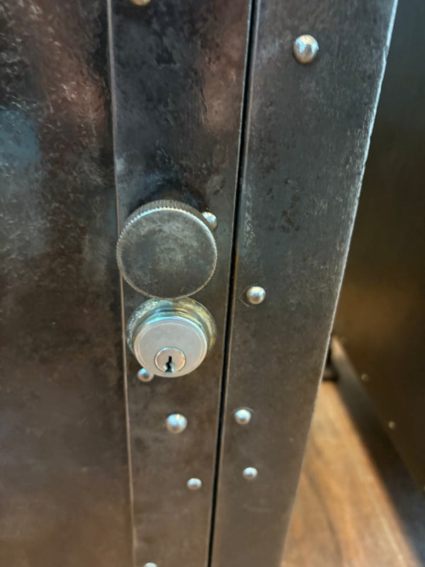These cabinets are unique and collectible pieces that have been carefully restored to their original condition. The cabinet interior features drawers with re-keyed locks. With their intricate hand-riveted design, they offer a touch of vintage charm and functionality for storing tools and hardware.