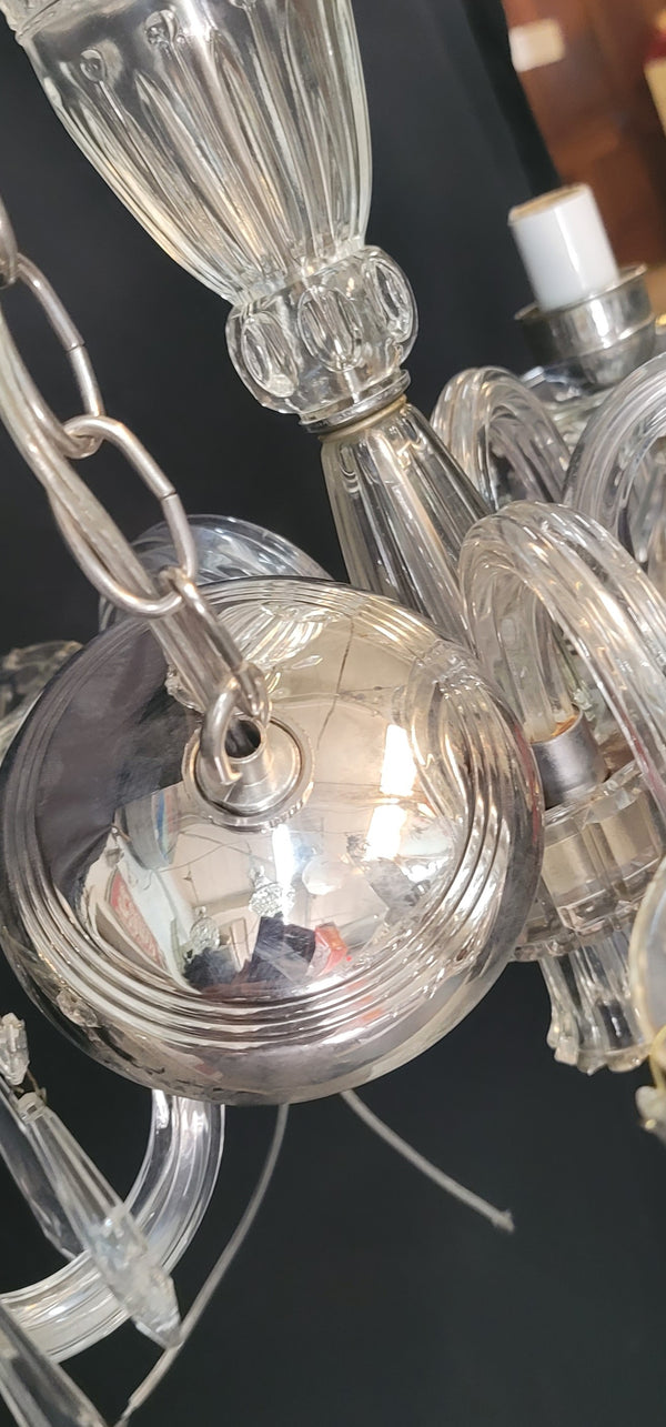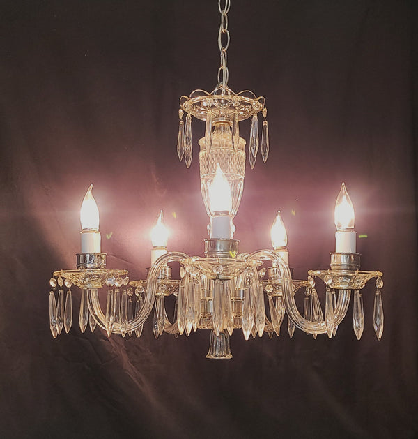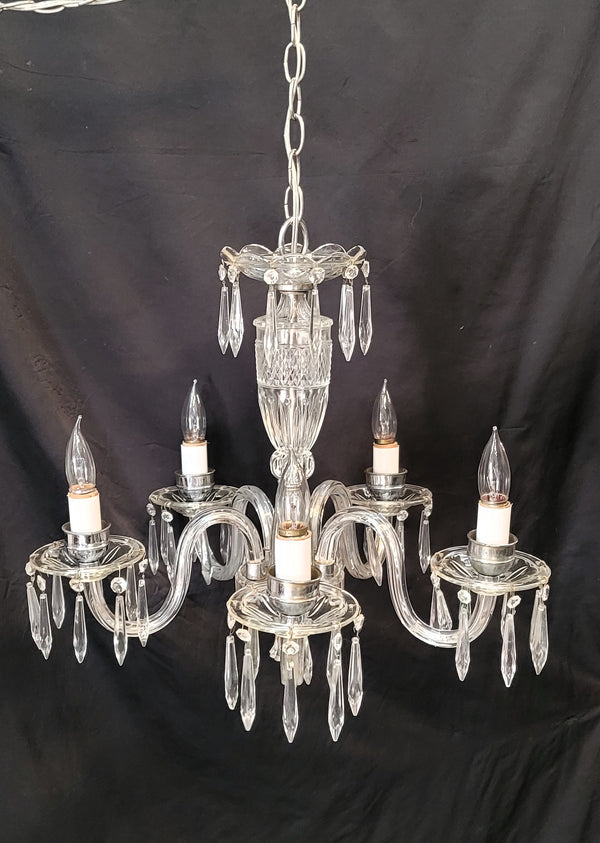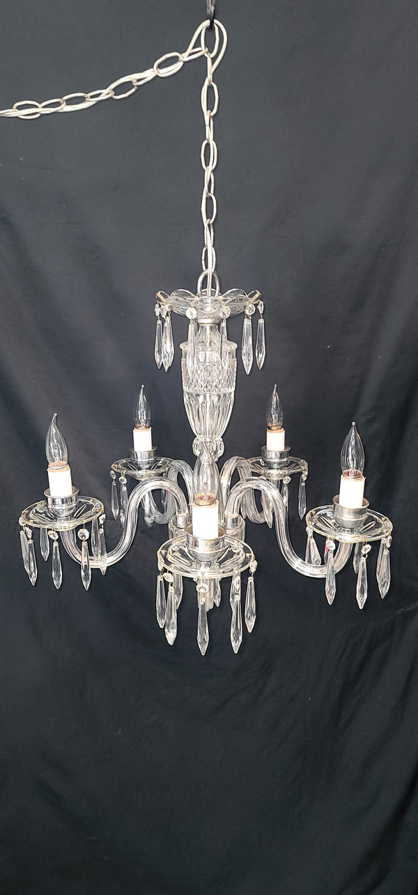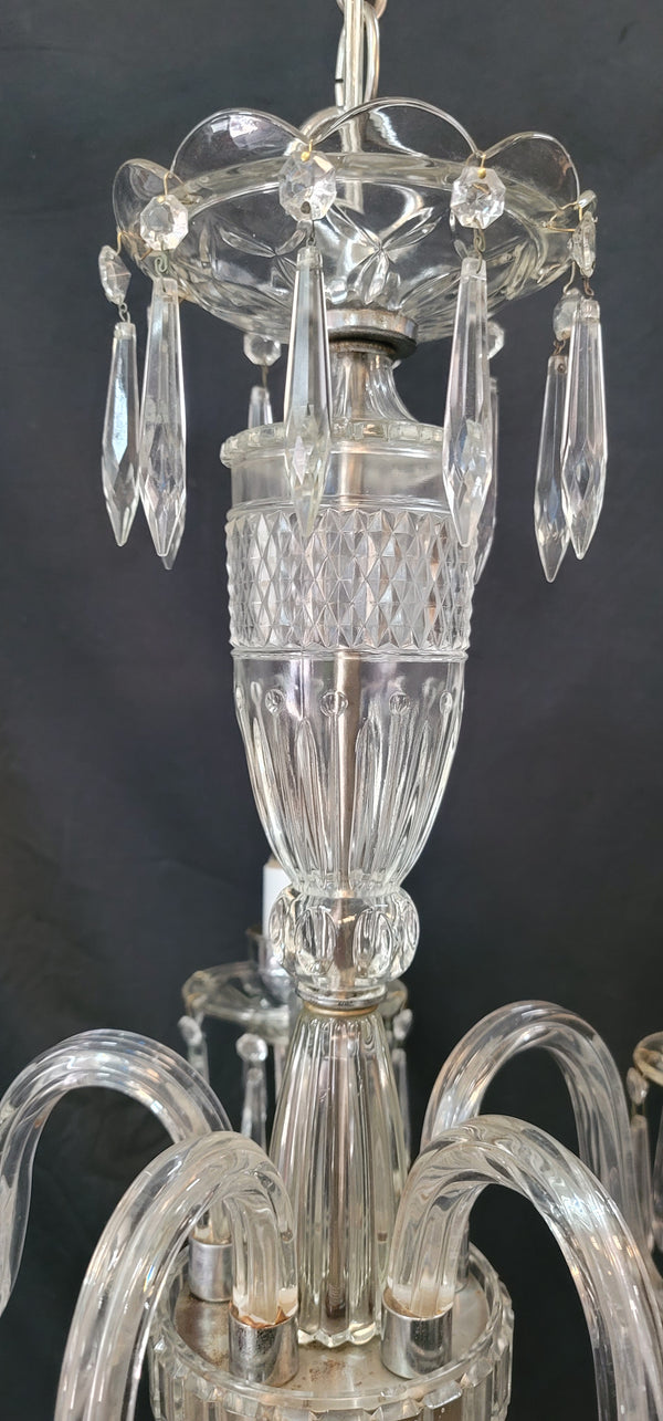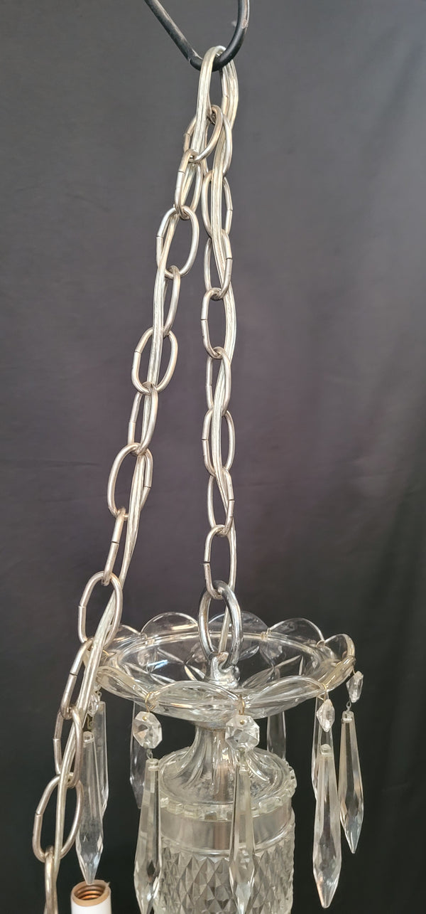 This fixture has a top scalloped canopy, fluted bobeche's, diamond pattern glass center and chrome trim. Each light assembly has faceted prisms all around with a chrome candlestick holder. The bottom center has a fluted finial.