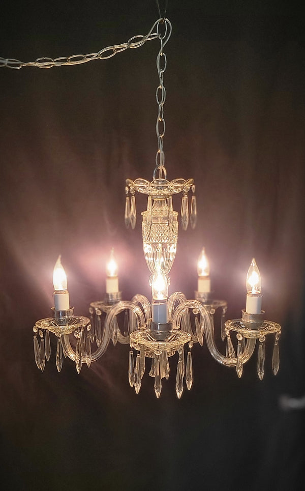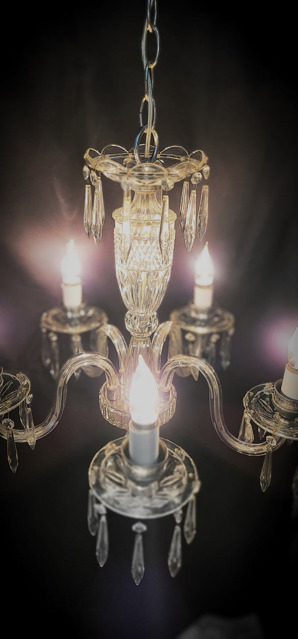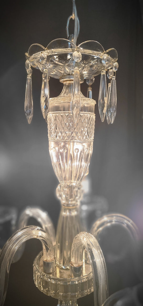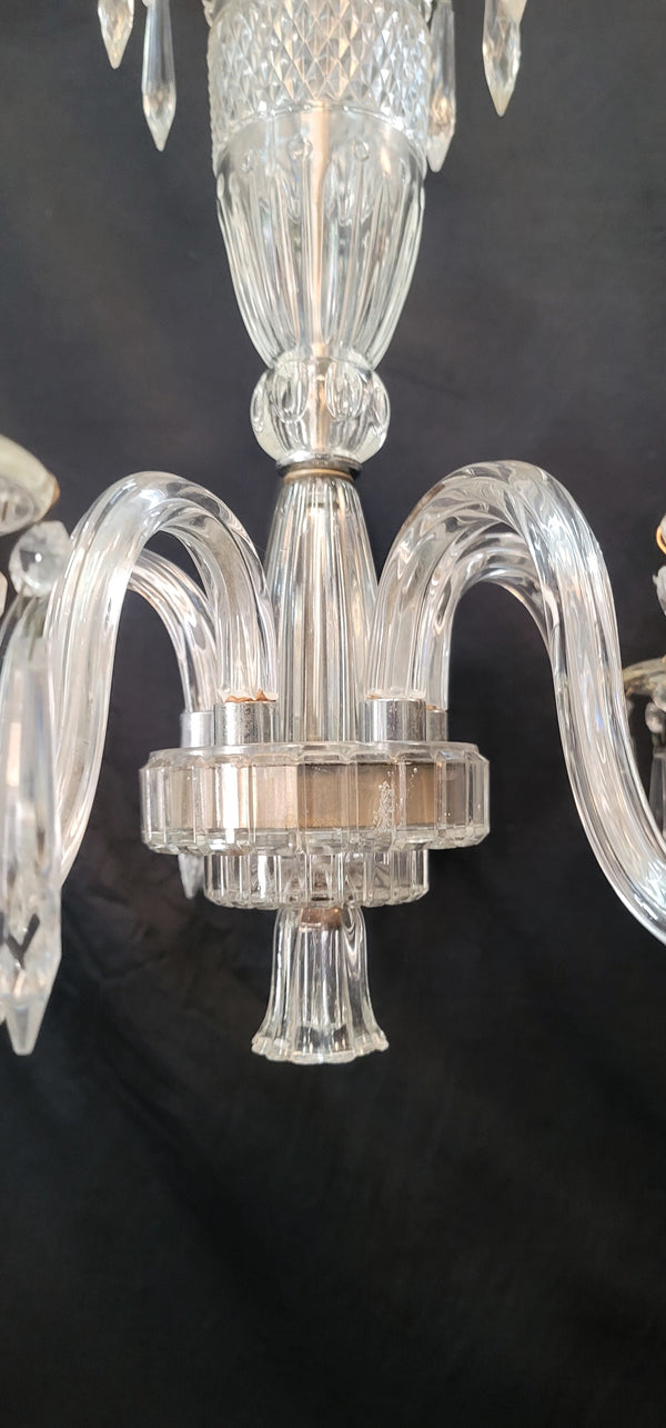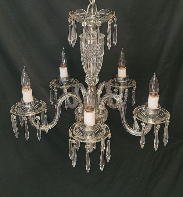 This fixture has a top scalloped canopy, fluted bobeche's, diamond pattern glass center and chrome trim. Each light assembly has faceted prisms all around with a chrome candlestick holder. The bottom center has a fluted finial.
