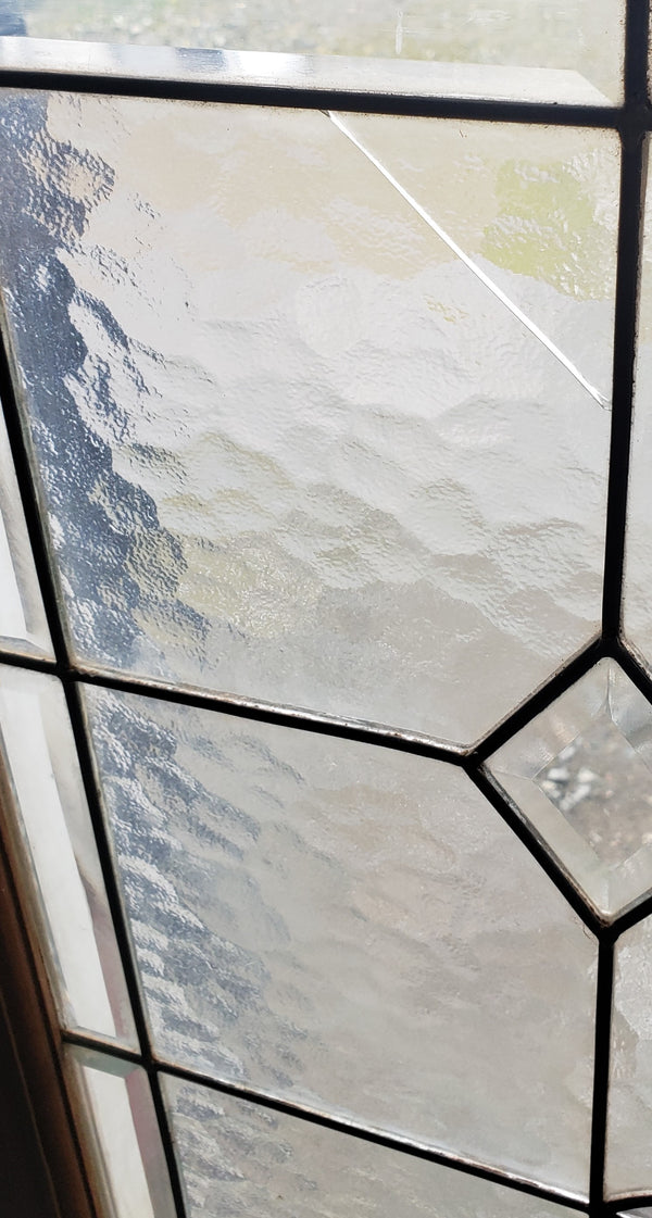 This window has a beautiful Art Nouveau design with thick beveled sections throughout. The textured glass resembles a "hammered" design. There are two diamond shapes at the top and bottom with all of them faceted and beveled. There is one crack in the glass at the top to the left of the diamond shape. The wood frame which has been stained has rounded inner corners top and bottom. The frame measures 3 3/4" wide by 3/4" thick.
