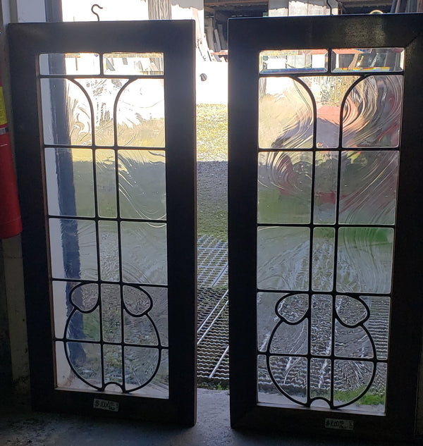 A pretty pair of Art Nouveau designed windows with textured deep wavy glass and framed in a stained wood frame. Excellent condition.