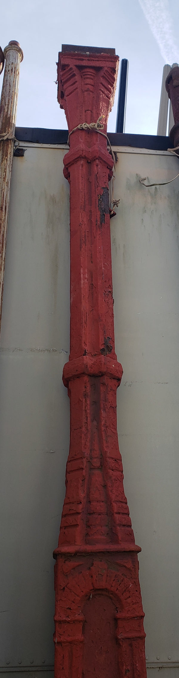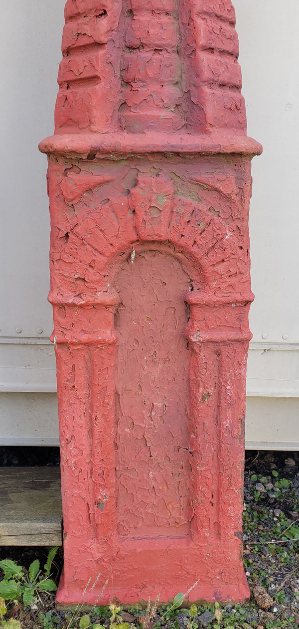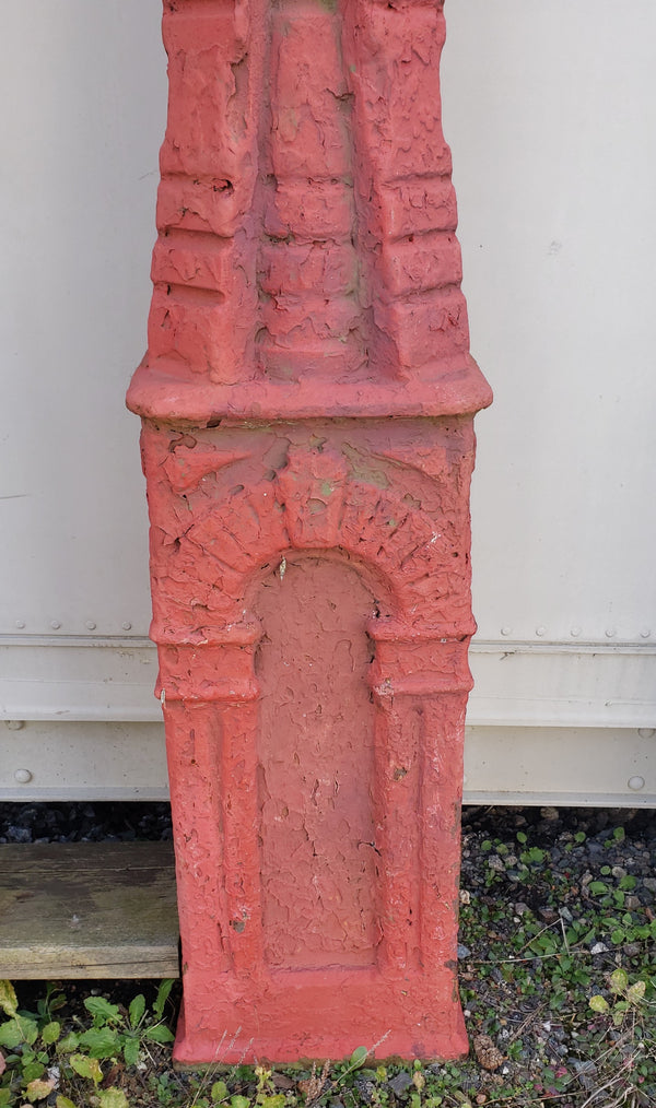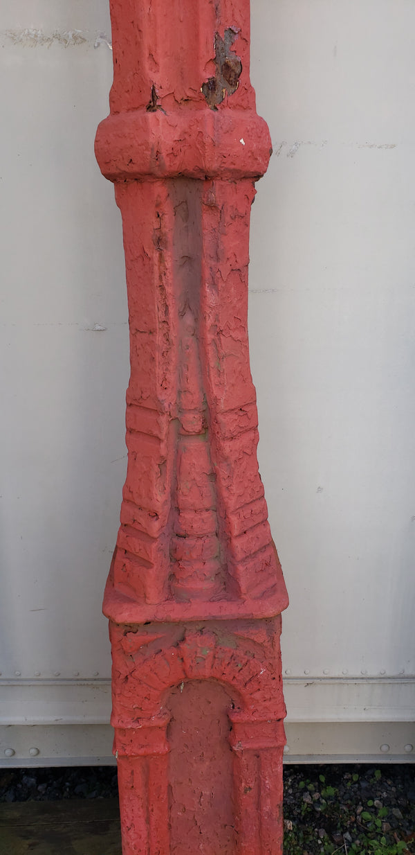 This column was salvaged from the Philadelphia, PA industrial area. All sides of the lower section of the column have an ornate arched double column design. Deep thick grooves climb up and around the column as it tapers to the top to show even more details. Makers mark (not completely visible) is at the bottom side which is pictured. Layers of red paint remain with flaking.