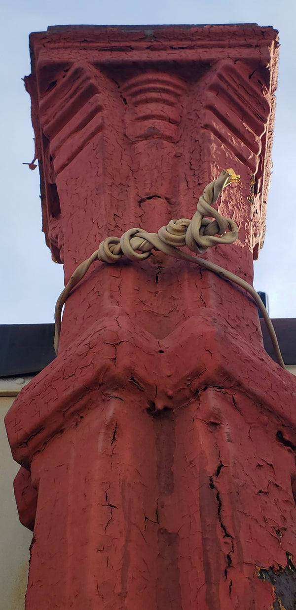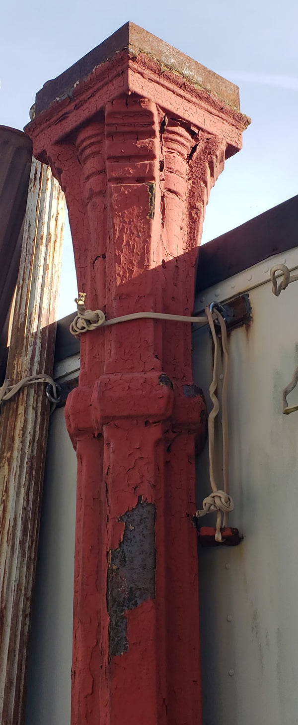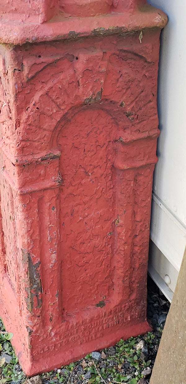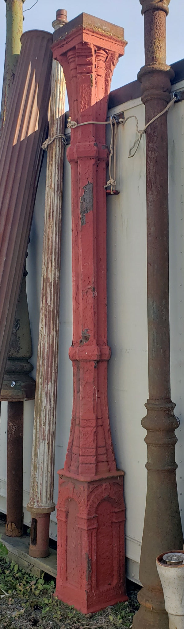 This column was salvaged from the Philadelphia, PA industrial area. All sides of the lower section of the column have an ornate arched double column design. Deep thick grooves climb up and around the column as it tapers to the top to show even more details. Makers mark (not completely visible) is at the bottom side which is pictured. Layers of red paint remain with flaking.