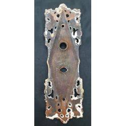 This back plate has a great filigree design and is made of brass. There is chippy paint seen throughout.