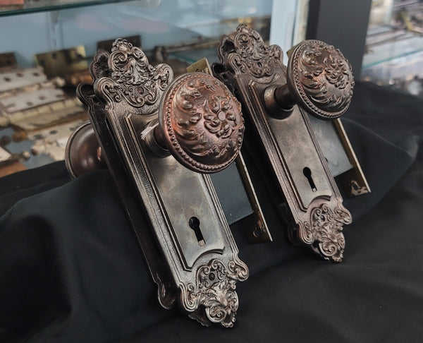 We've restored these lock sets with removing all dirt/rust/paint from the backplates and doorknobs, wire wheeling and polishing. Beautiful example of Victorian style. Each set comes with lock box, two backplates and two doorknobs.