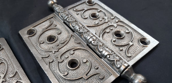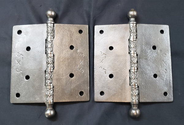 Heavy duty and ornate hinges which were restored by wire wheeling and cleaning. Each one also has the ball top finial.