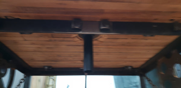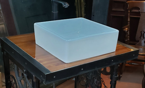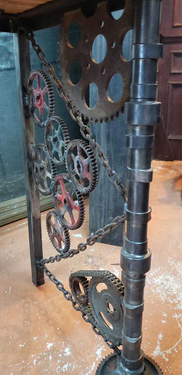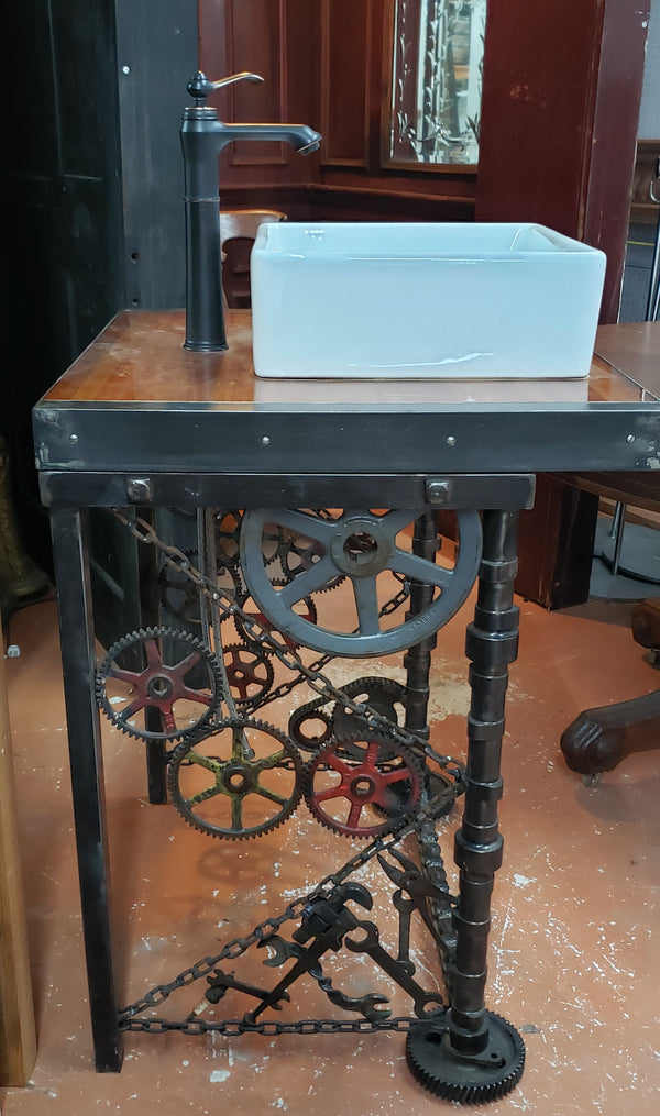 This vessel sink top vanity was made in our shop using reclaimed and new materials. The sides of the vanity were created from salvaged gears, chains, pistons, wrenches and more. The top wood base (2 1/2" thick) has reclaimed bowling alley flooring which was cut to size then coated with spar urethane. A thick steel band then was wrapped around all sides and secured. The sink is permanently attached to the wood top. The wood and machinery were salvaged from homes in historic Richmond, Virginia.