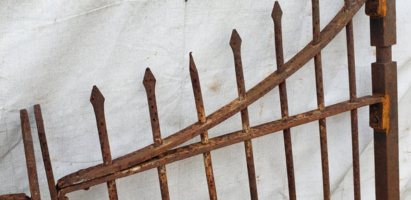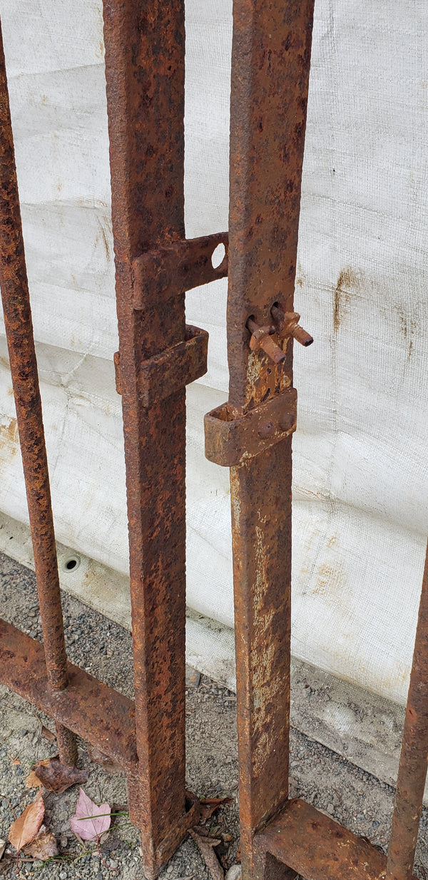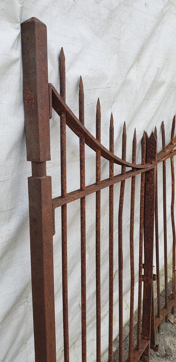 This gate set can be used for any garden entrance, alleyway, throughway, and more. It has solid cast iron 1 inch square post ends along with a couple of existing center hinges remaining. Arrow point finials at the top with a couple of iron rods in need of adjusting.