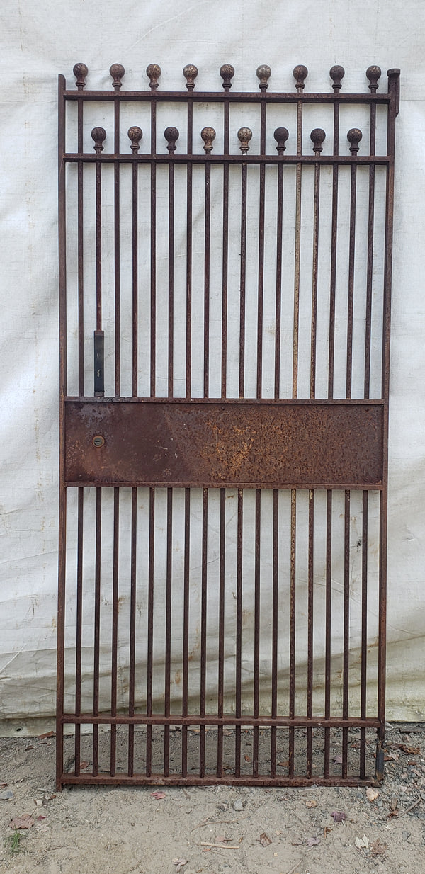 This is a heavy duty gate that has it's original lock box with ring bell (does not work currently). At the top is a double row of round steel ball finials. The bottom right side has been recently repaired by our welder. Rust finish exists throughout surface.