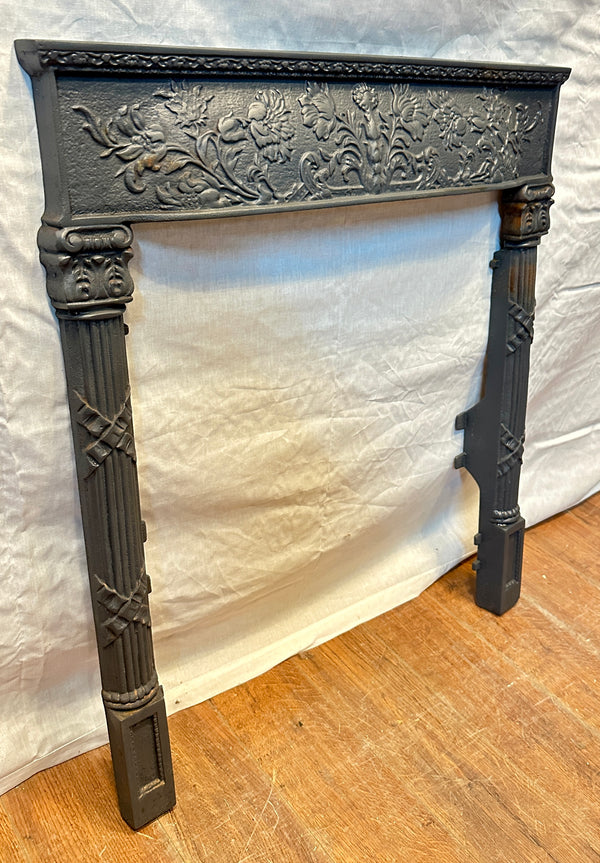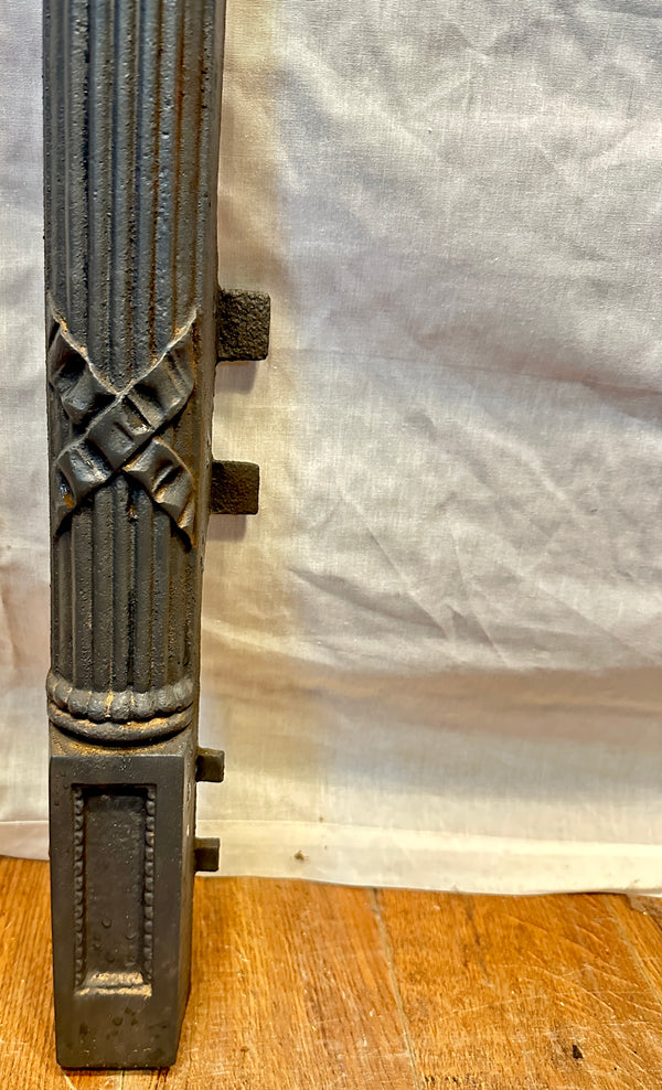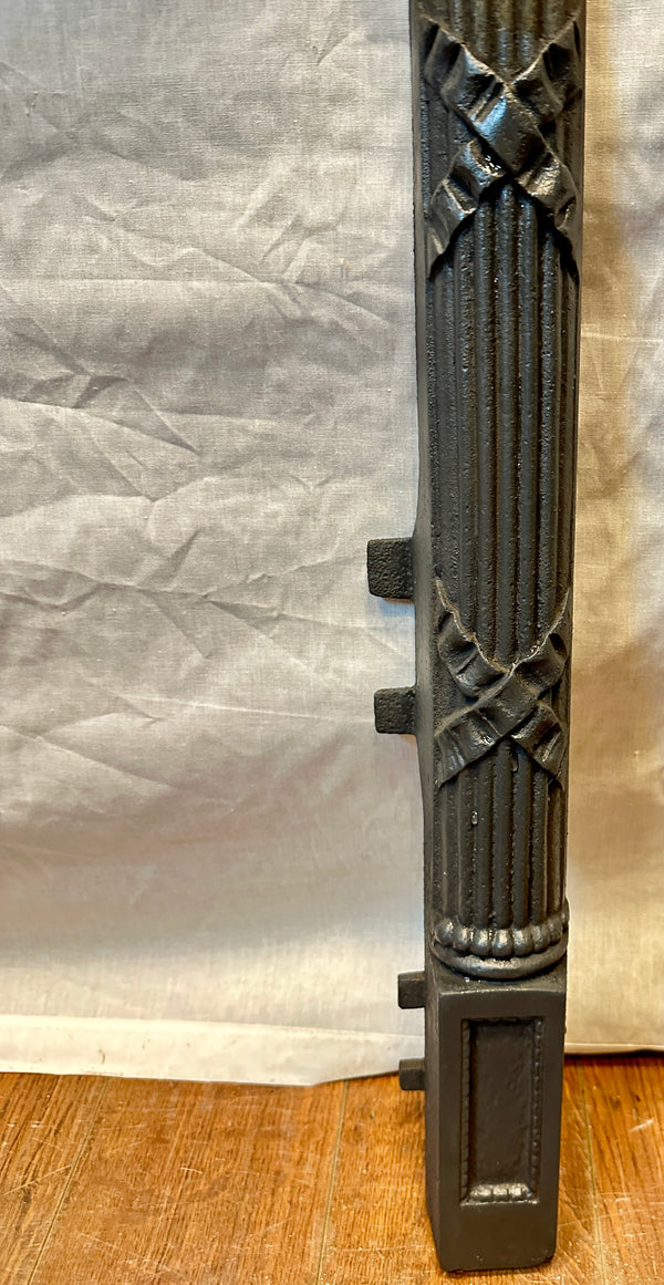 This product is a restored antique iron fireplace surround, adding a touch of history and elegance to any room. The intricate design and craftsmanship of the surround make it a unique and eye-catching piece.