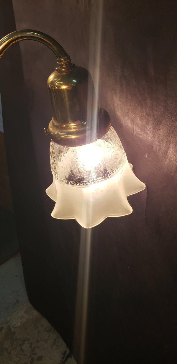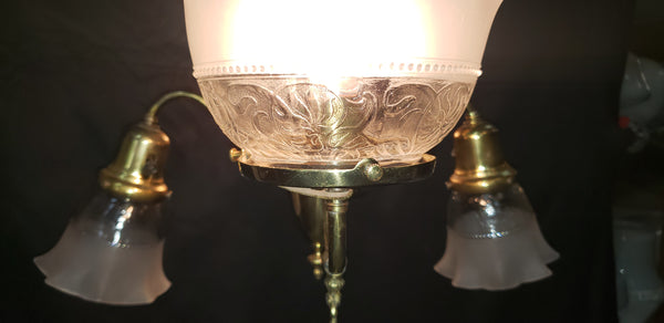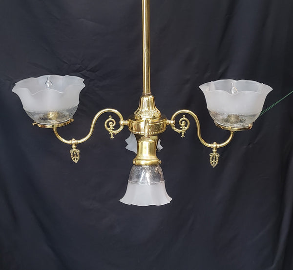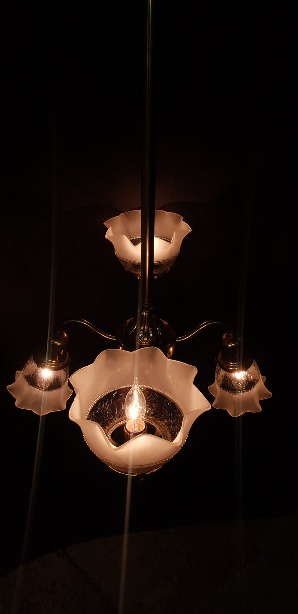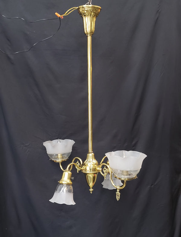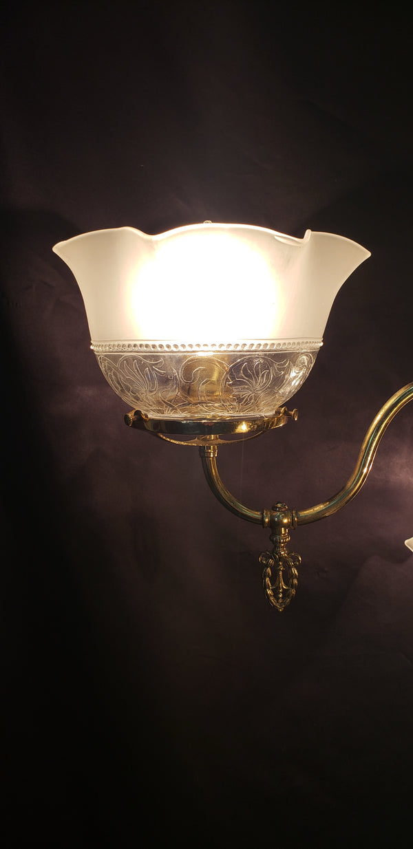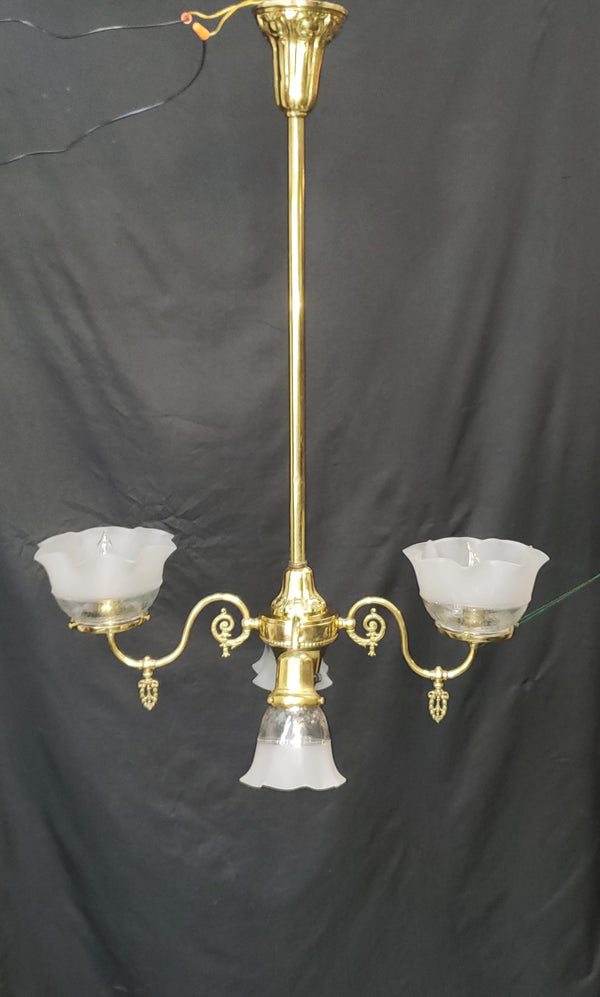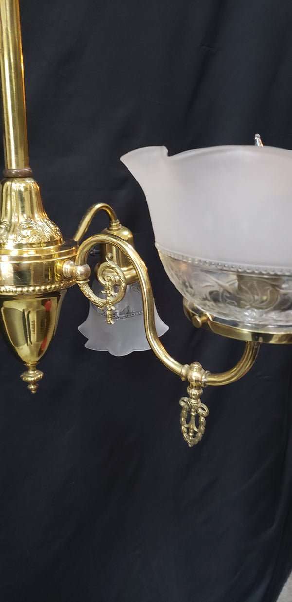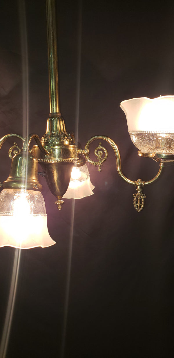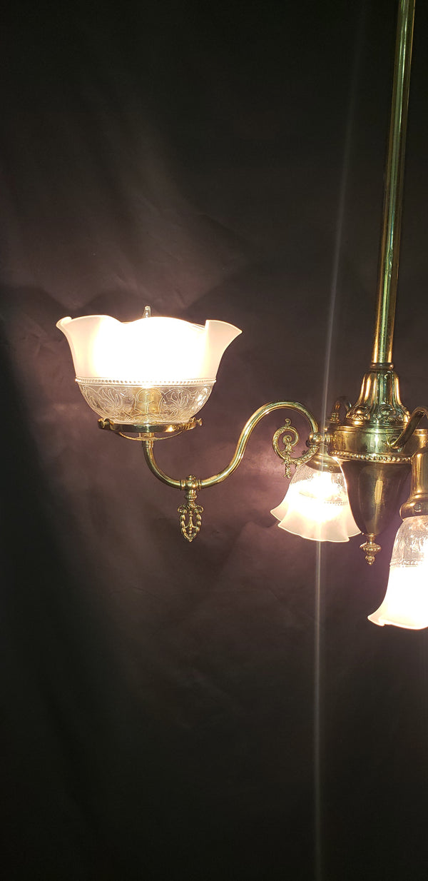 This Victorian style chandelier has a center brass rod that mounts flush to the ceiling. The smaller sockets point downward and have on/off switches at each socket. The larger ones flute upwards and are stationary. The entire fixture has new wiring throughout along with new sockets. All of the shades are matching and are opaque to clear and fluted with designs on the clear sections.