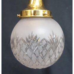 We've restored this fixture by updating the wiring throughout and adding a new socket as well as applying a new coating of lacquer and polish. The glass globe has a very pretty criss cross cut glass design.
