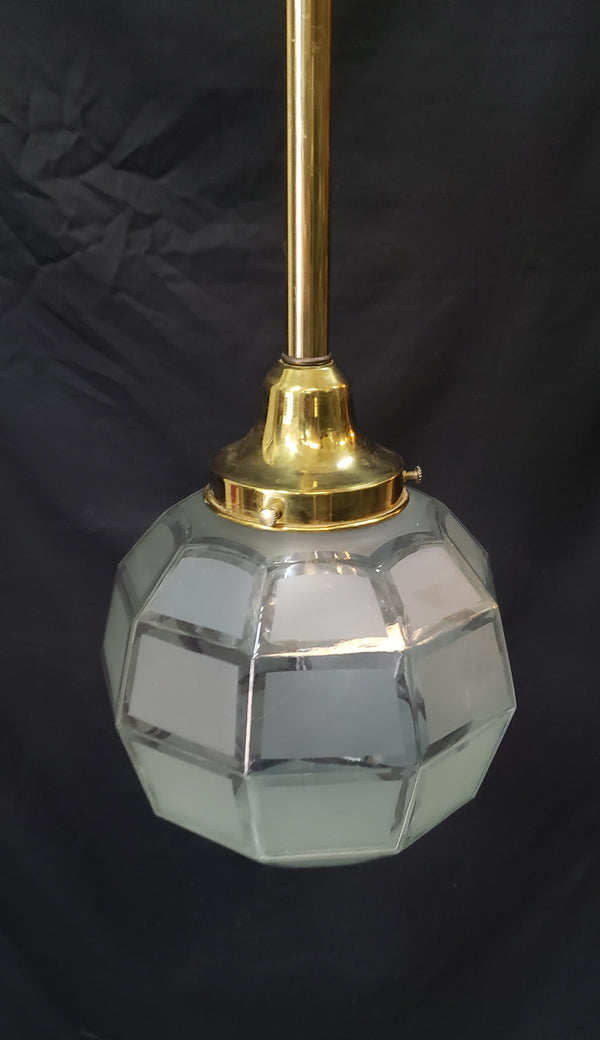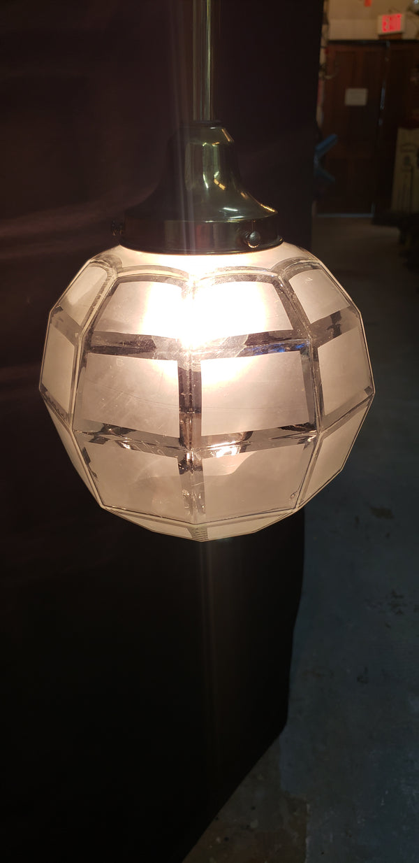 This mid century modern fixture has numerous squares and sides (9) and an opaque color to clear within the squares. We've updated the wiring and sockets on this fixture as well.