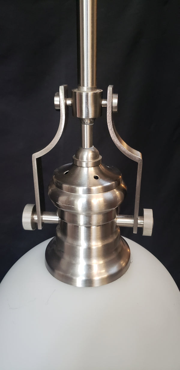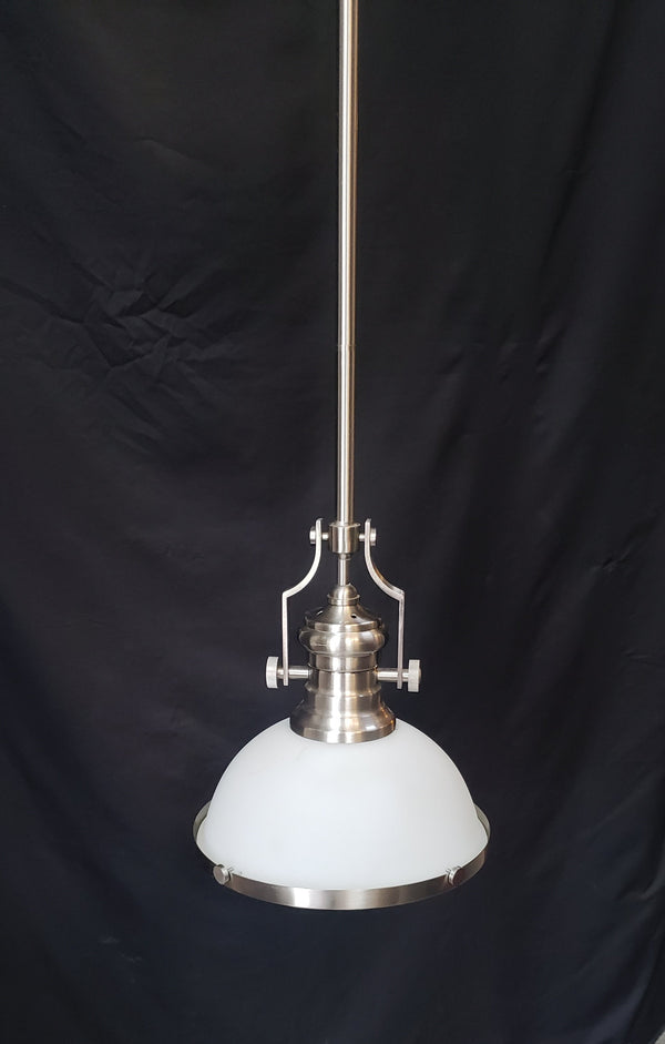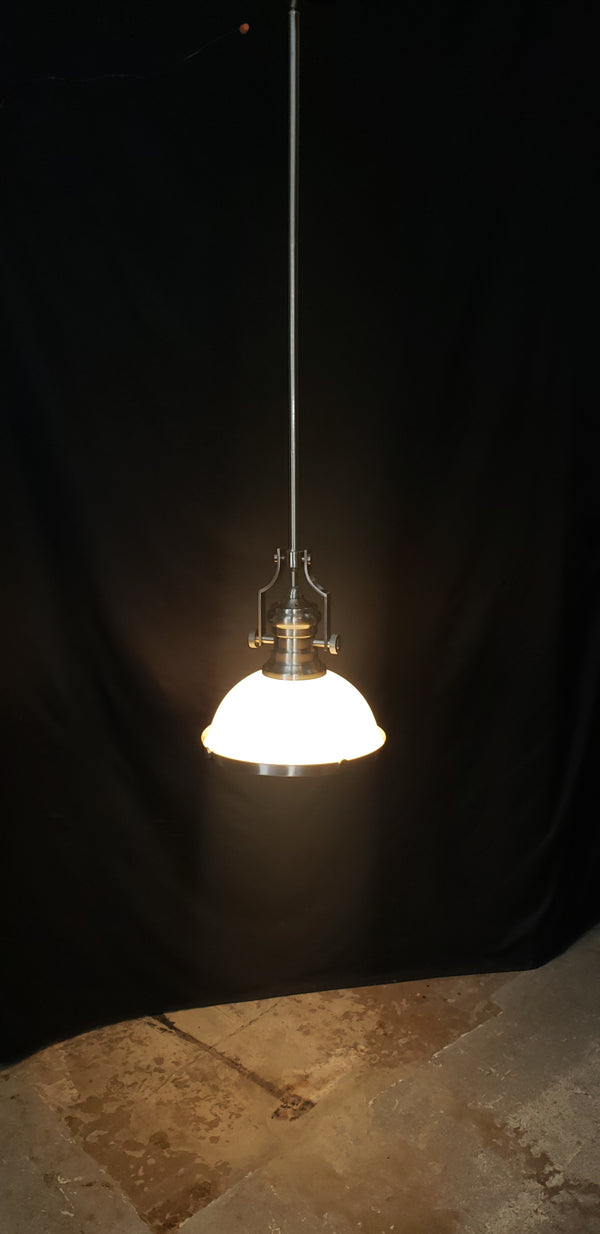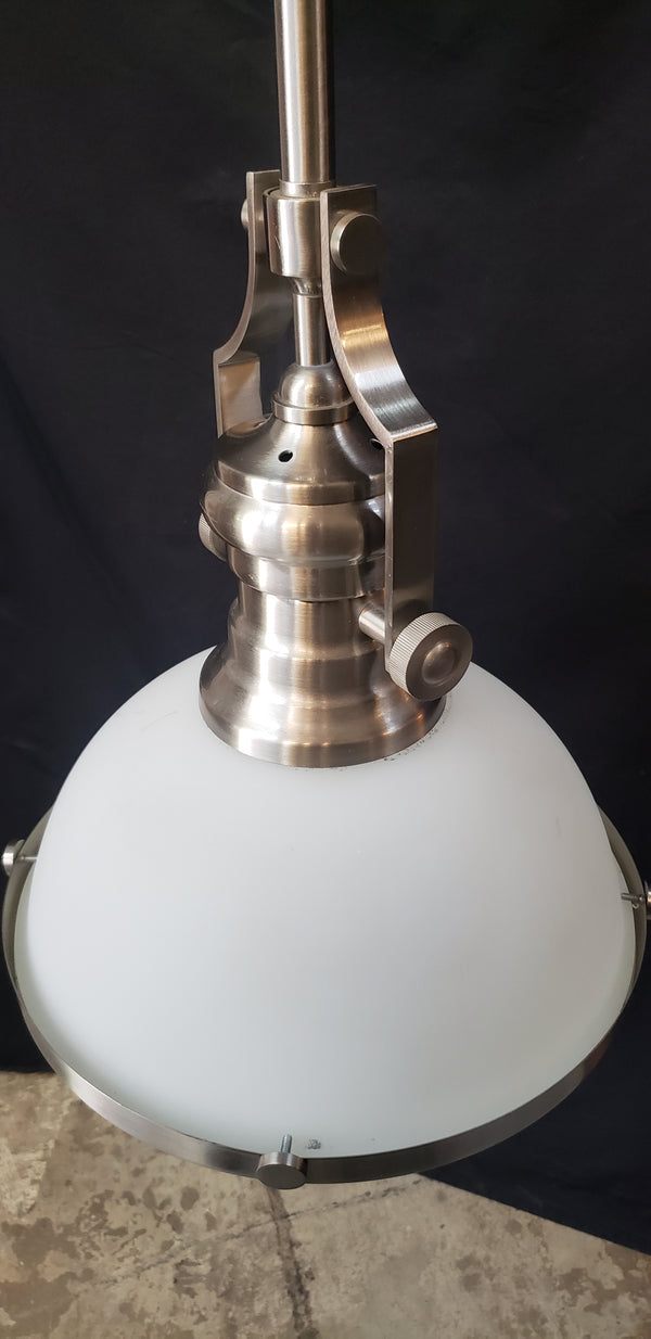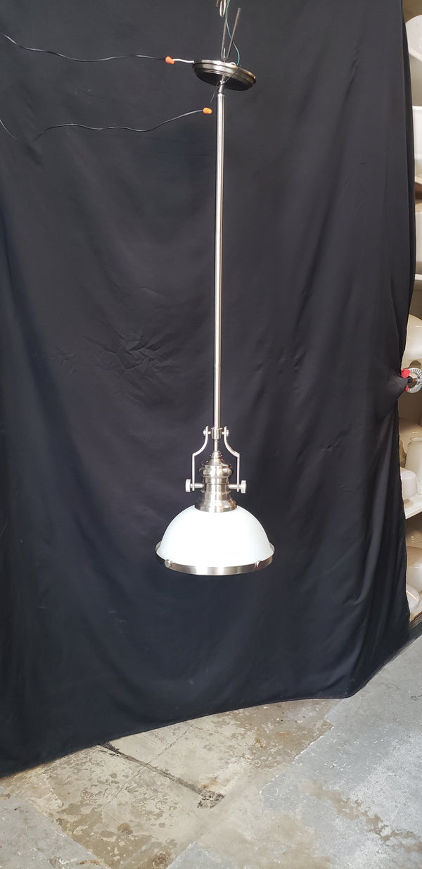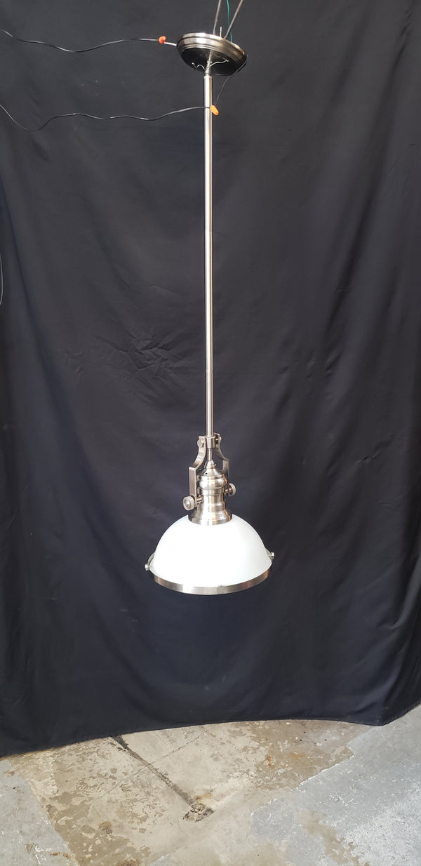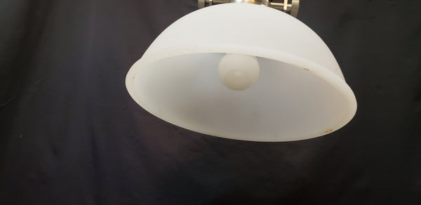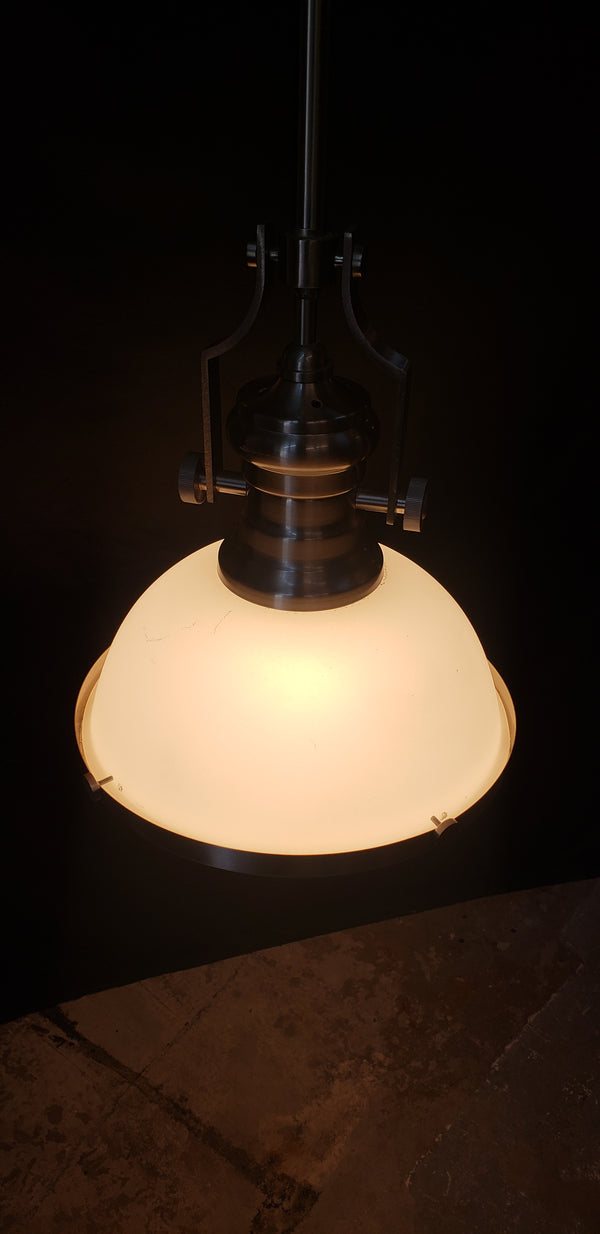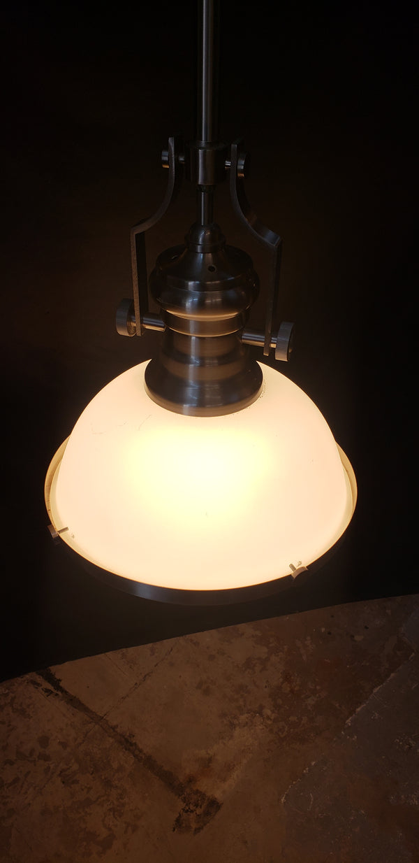 This industrial pendant light fixture is in great condition and light weight. Surface exterior is metal and chrome with the off white shade made from a type of plastic product. It takes one bulb at the center and has a flat plexiglass cover at the bottom.