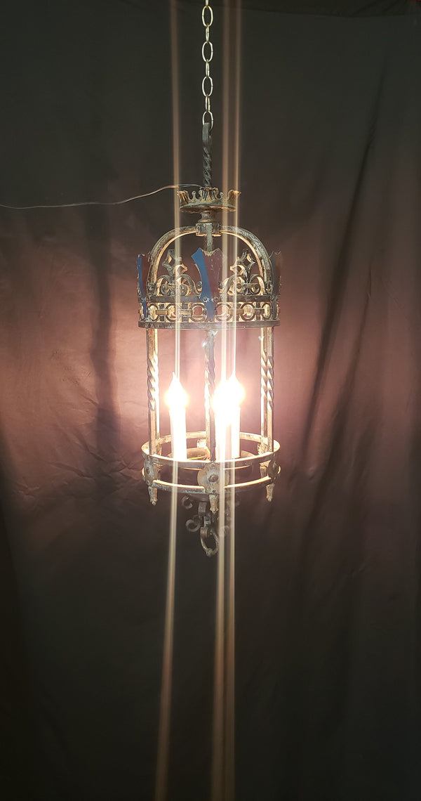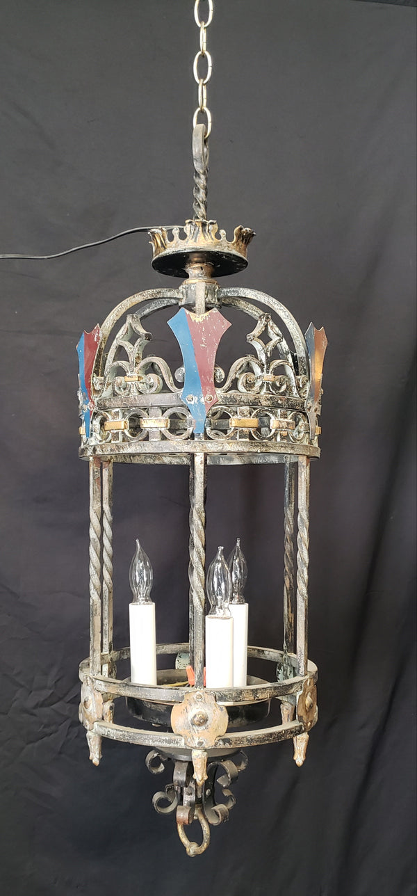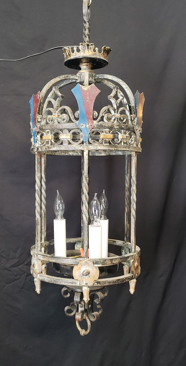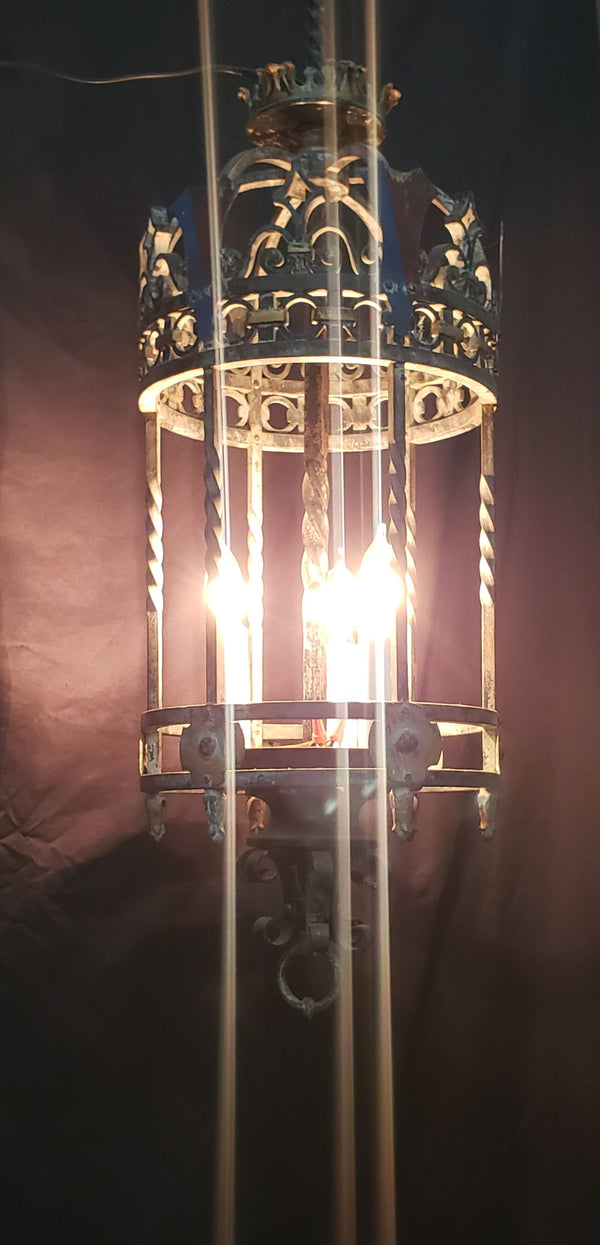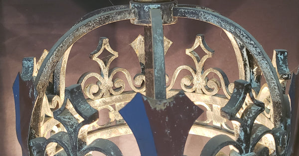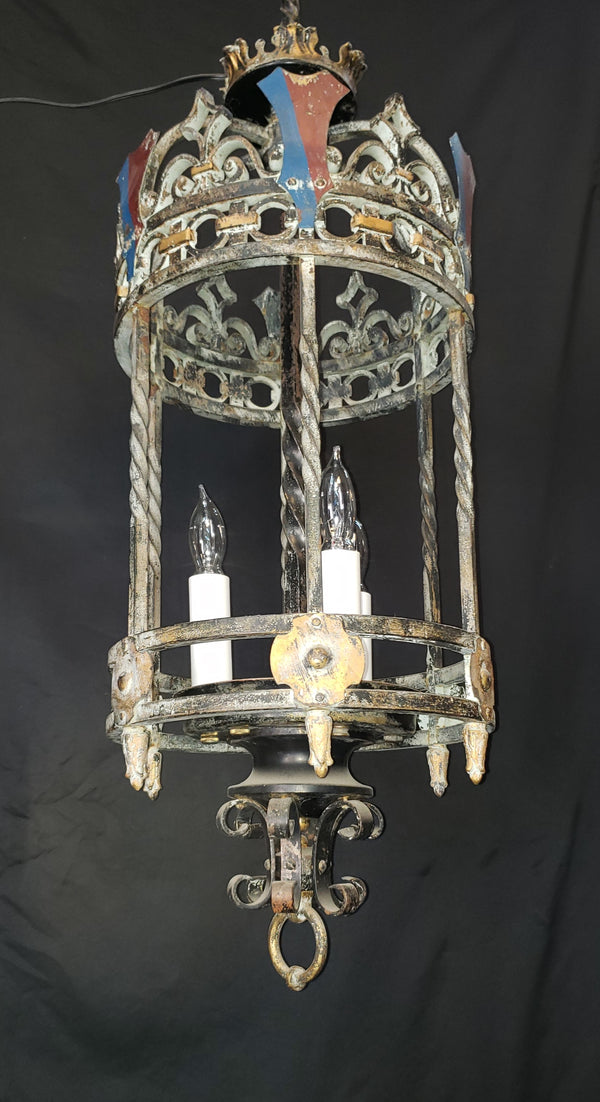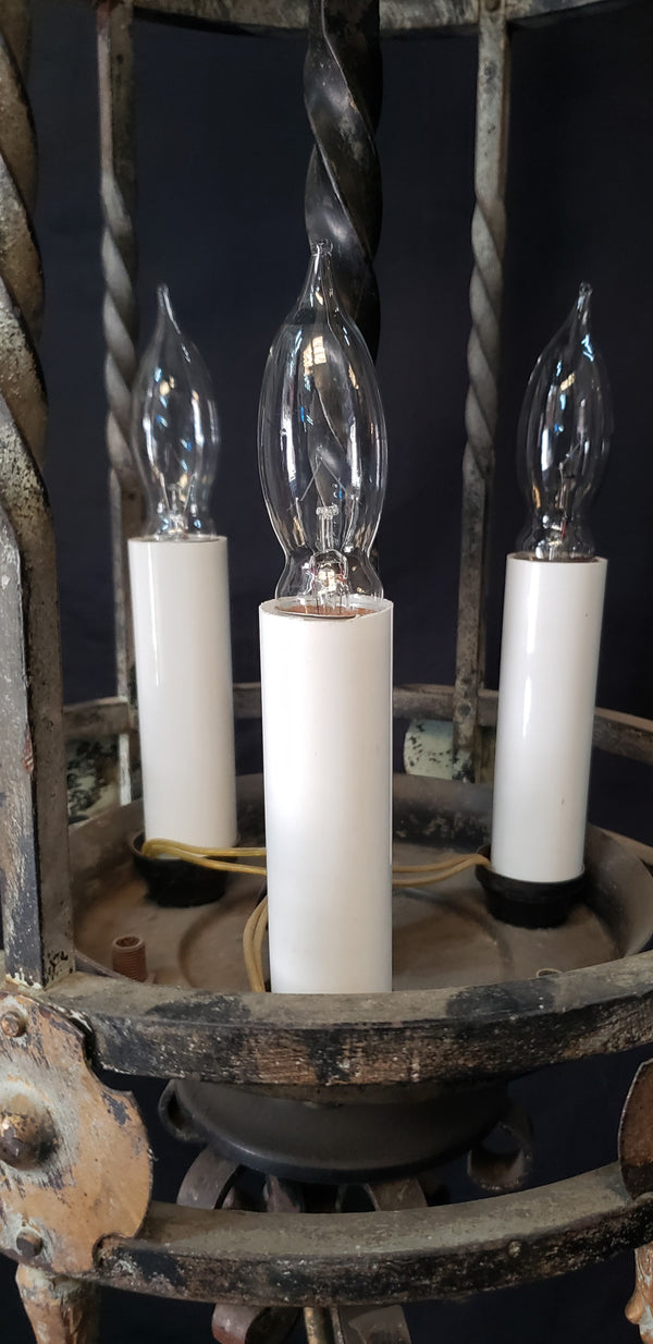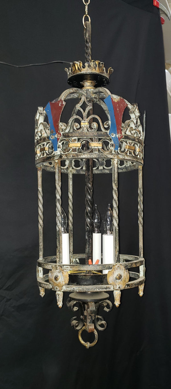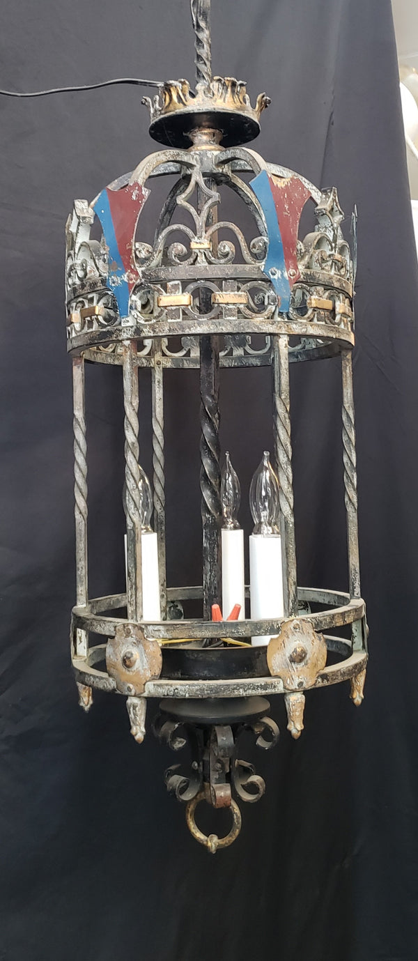 We've restored this ceiling fixture by replacing all wiring, sockets and candle covers. It is an open design with ornate wrought iron rods with flower petals and a prominent crown top. The bottom center has a curled finial design and the very top of the fixture has an existing iron hook. Original multi colored paint remains at the top crown.