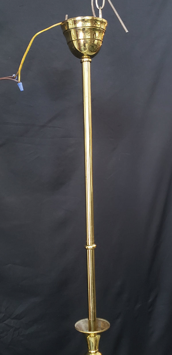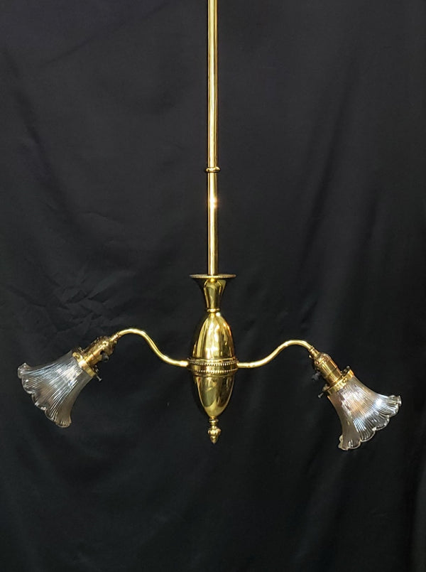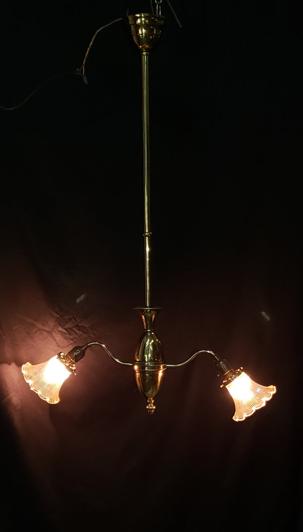 This flush mount pole drop chandelier has two fluted ruffled shades which match the trim on the fixture. Great condition.
