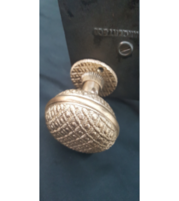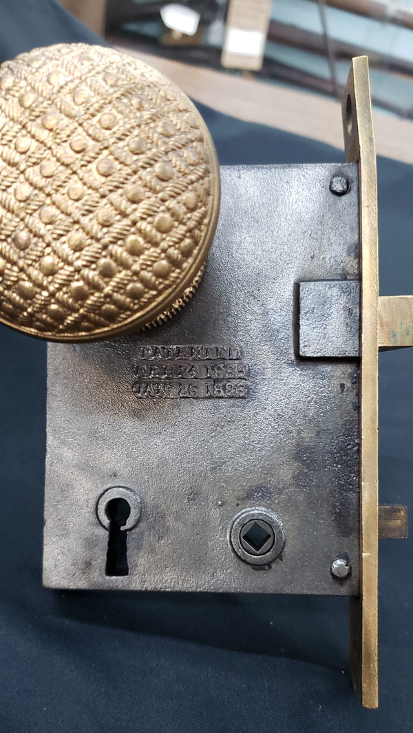 This set has an incredible unique design. The knobs have raised circles in a criss cross pattern. The lock box outer plate has tons of geometric shapes with matching thumb turn and back plate. All parts of this set have been restored with professional cleaning, wire wheeling and polishing. Set includes: Mortise lock, two door knobs, two round matching back rosettes, thumb turn with back plate. Note: There is a slight bend in the plate at one end which can be adjusted once installed.