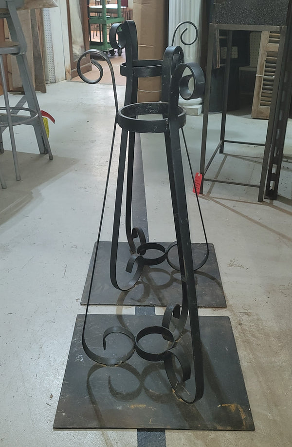 This is a very large pair of custom wrought iron planters. They have a large square bottom iron base along with an upper and lower space for plants. Great condition with some minor blemishes .