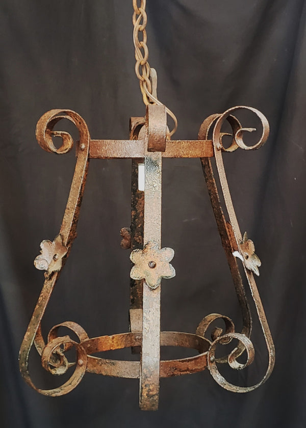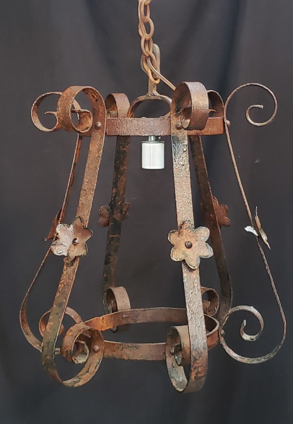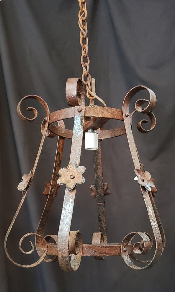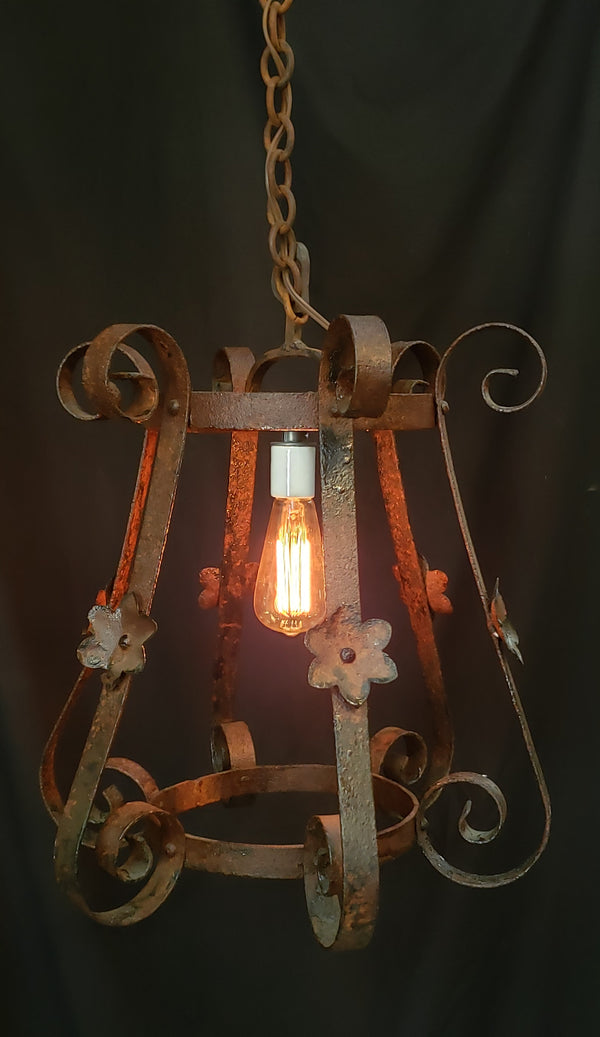 We created this unique ceiling fixture from reclaimed wrought iron fencing from historic Richmond, Virginia. Long "S" shaped iron pieces - which have their original flower petals -  have been welded onto a top and bottom round inner frame. It has new wiring and a new center wide socket base.  Shown with a 60 watt amber Edison bulb.
