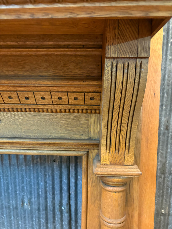 This Solid Carved Oak Mantel with Beveled Mirror is an elegant and high-quality piece of furniture. The mantel is made of oak, with intricate carvings and a beveled mirror attached.