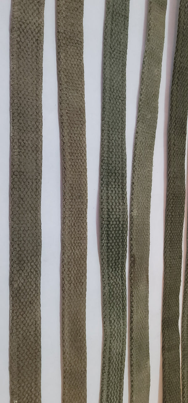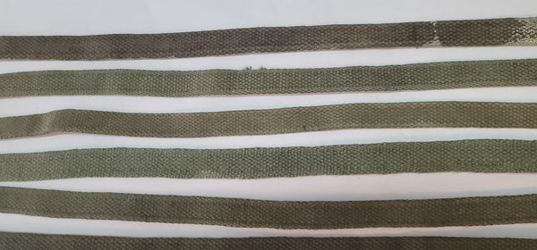 Made from canvas material with metal buckles and tie ends. The straps were rolled and taped together with some of the residual masking tape remaining on some. The coloring does vary from OD khaki to light military green.