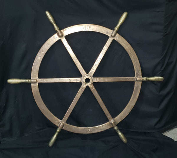 Used for the main steering during WWII and at the helm station on the flying bridge of liberty ships. Constructed of solid bronze & red brass and weighing approximately 55 pounds. The brass grips are shaped like bowling pins and were attached separately to the wheel. The center shaft hole has a keyed slot to prevent slippage. One of the spokes is marked with "SGA 81" in raised lettering and pictured. Excellent condition with no chips, breaks or cracks.