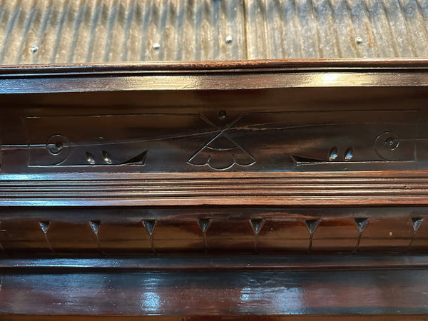This Victorian Era, Eastlake Mirror with Beveled Mercury Glass is an antique piece that exudes elegance and style. This mirror features its original, naturally distressed mercury glass. The wood frame features intricate wood carvings indicative of its Eastlake style.