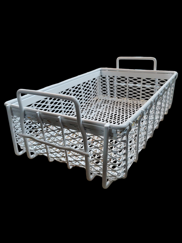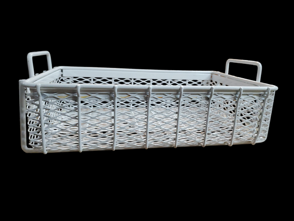 This salvaged wide mesh factory parts bin is perfect for storage. It has handles and has been powder-coated.