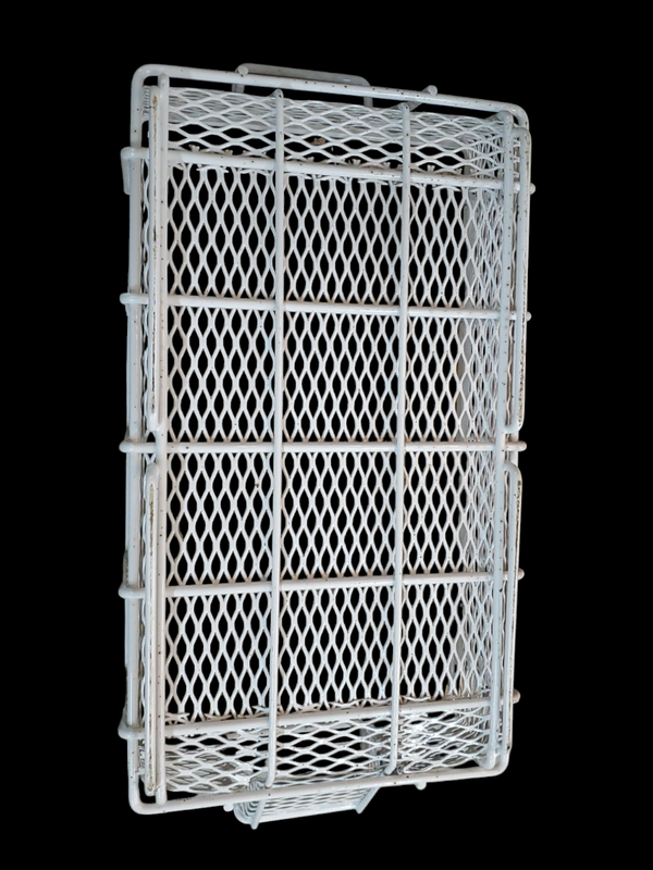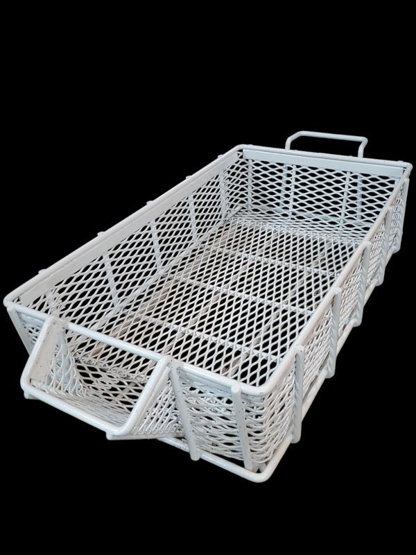 This is a salvaged, wide mesh factory parts bin and is perfect for storage enthusiasts who are looking for a durable and sturdy solution.