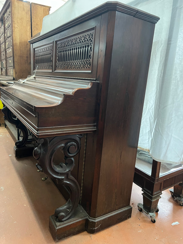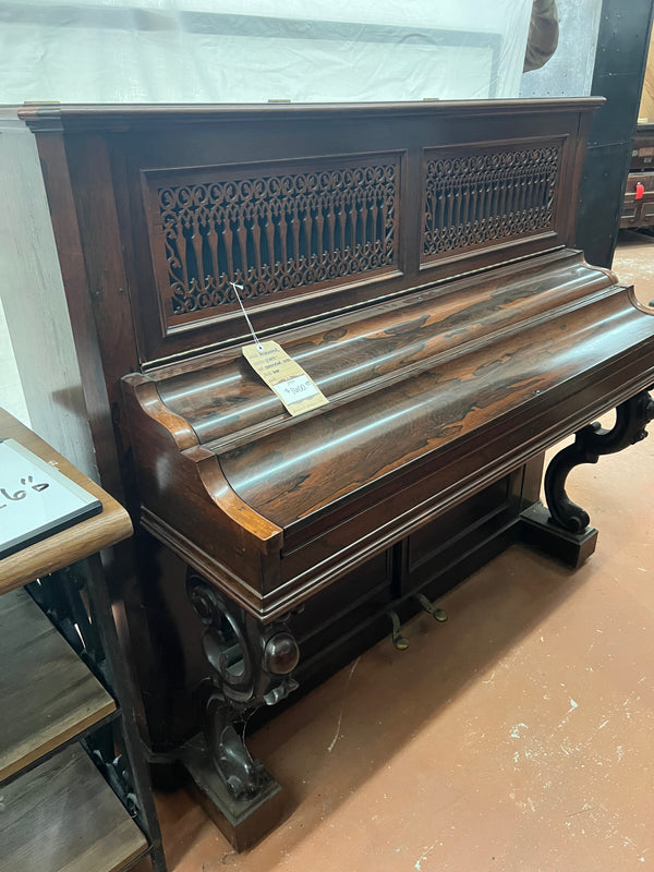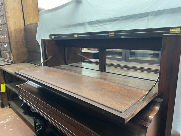 One of the Governor's very own creations... what we have here is an antique rosewood piano that has been repurposed and polished up to be turned into a neat bar cabinet perfect for any speakeasy or at home bar! The interior features a beautiful cobalt blue velvet lining and the top of the piano is mirror backed for that extra pop of WOW!