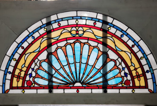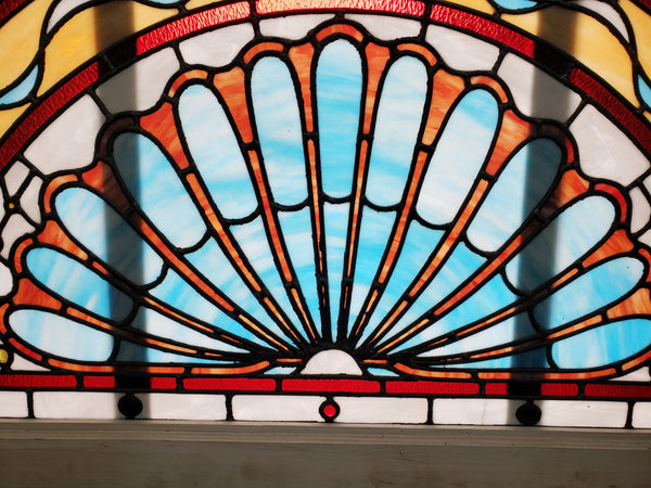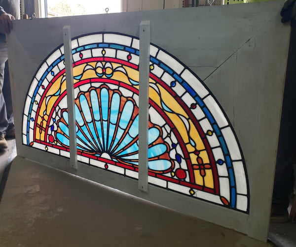 This very large half circle window is quite stunning with all of it's sharp colors. There are two types of textured glass along with round faceted roundels throughout. Pictures show both sides of the piece and does show differently on both sides. Two wood braces are seen on the interior side. There are two small cracks in the glass which is pictured in this listing.