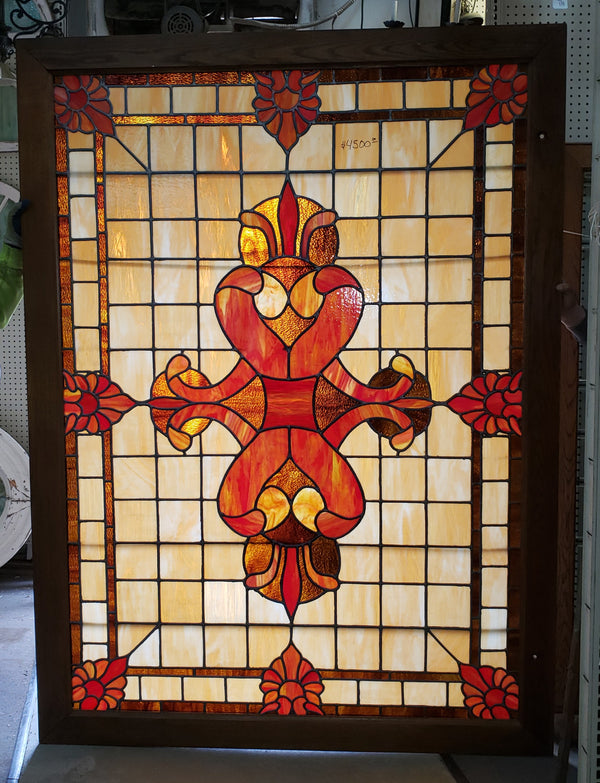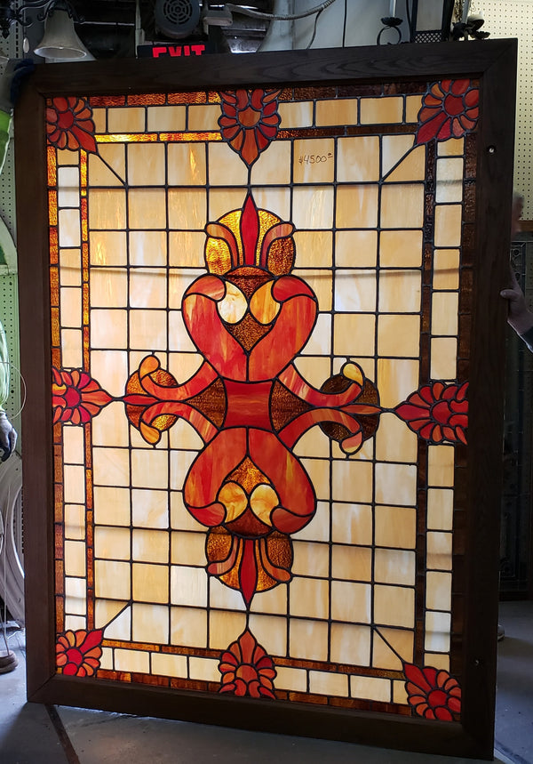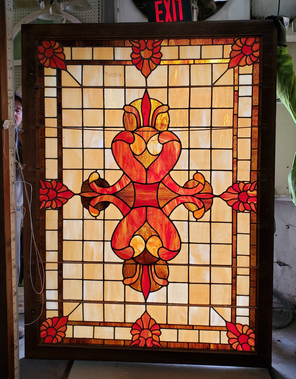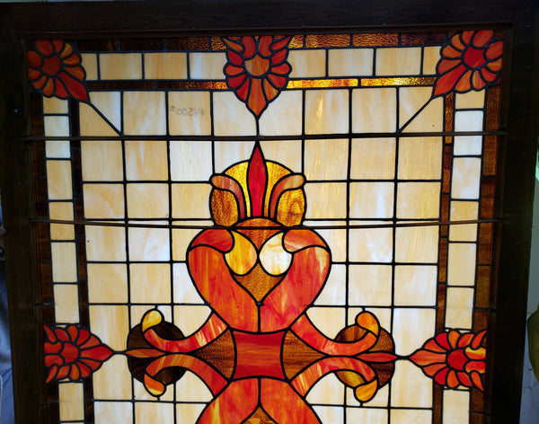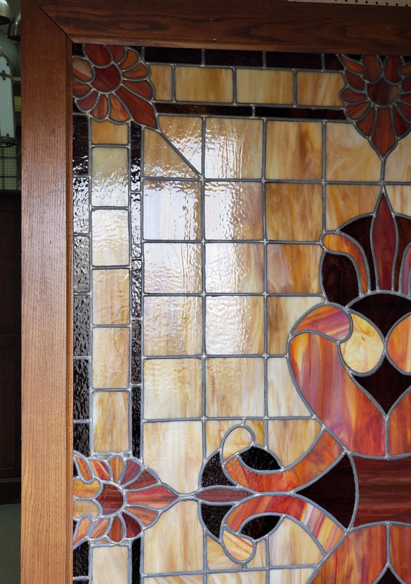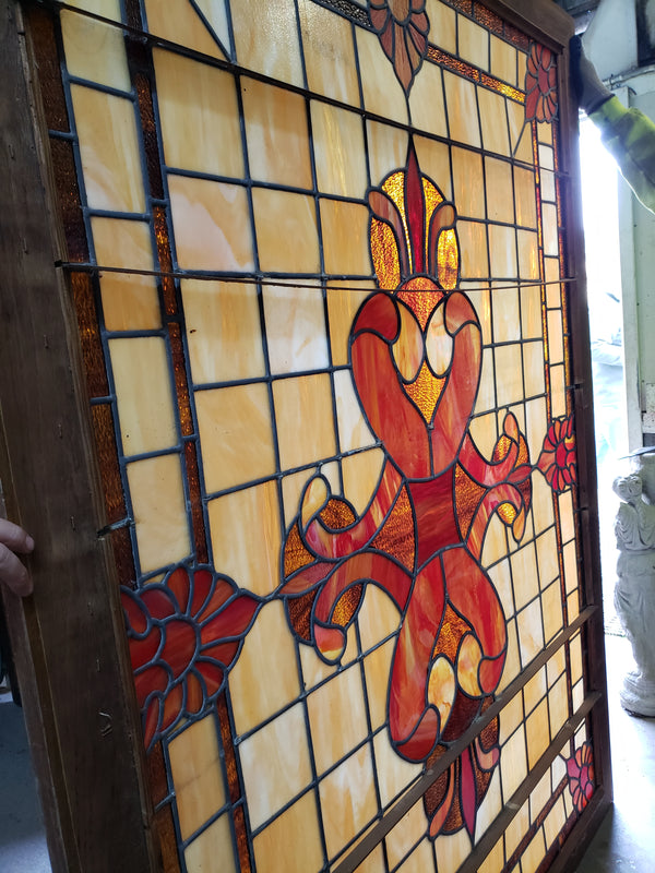 This window is massive measuring almost 7 foot tall. The Art Nouveau design is in fantastic condition and free from breaks and cracks. It has 4" dark wood framing which is also in great condition. Both sides are shown with the interior having two metal support bars which go directly across.