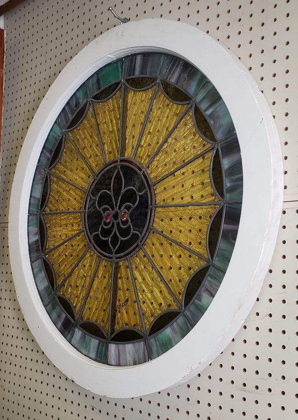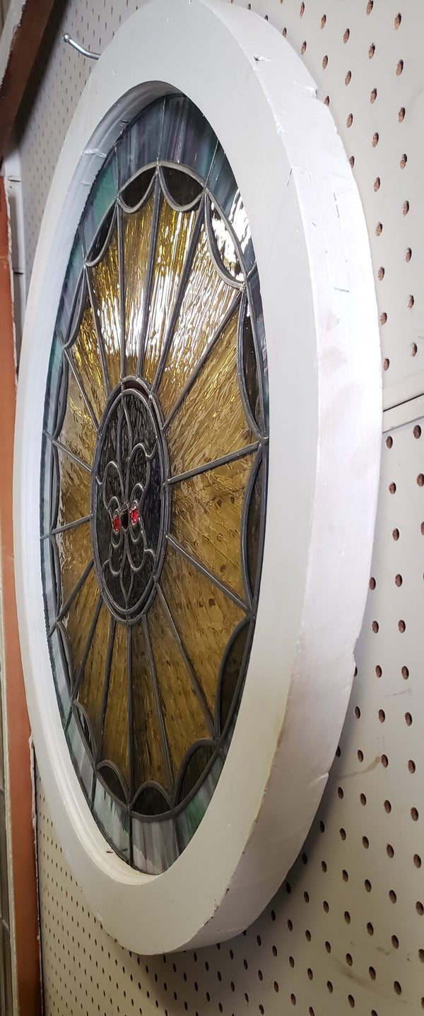 Unique 32" Round Leaded Textured Stained Glass Window in Wood Frame GA9521