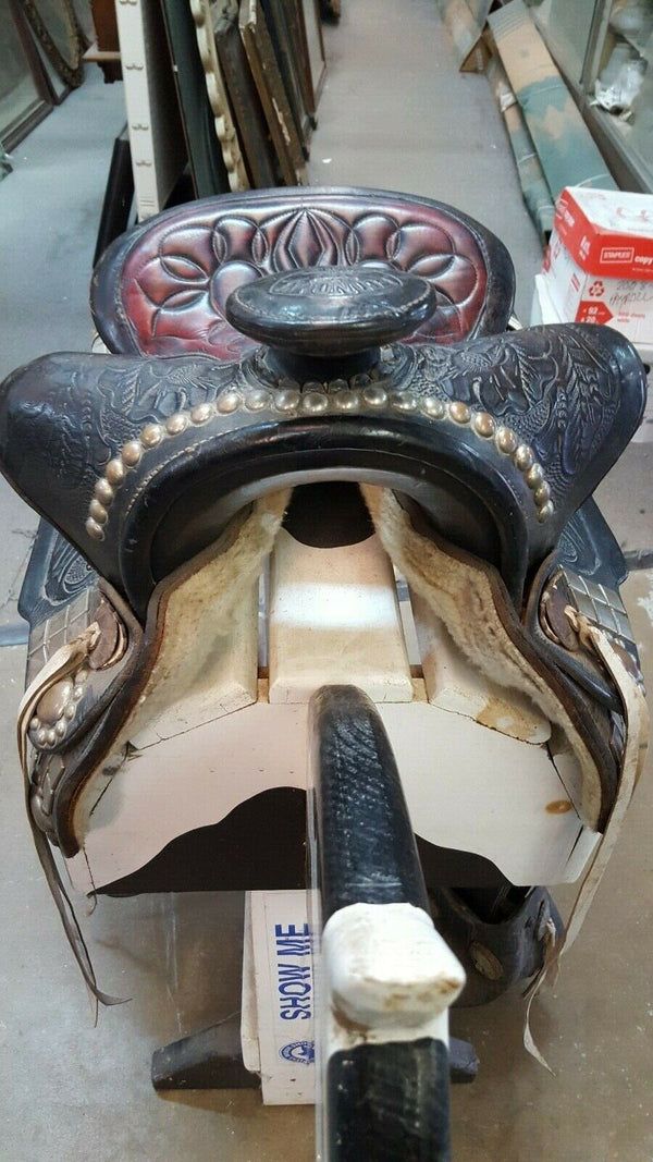 Multi colored ornately tooled leather saddle with silver embellishments. Saddle size is a 16". Fantastic details and design. In very good condition! #299 and MGM Prop imprinted on saddle. Very solid and heavy duty.