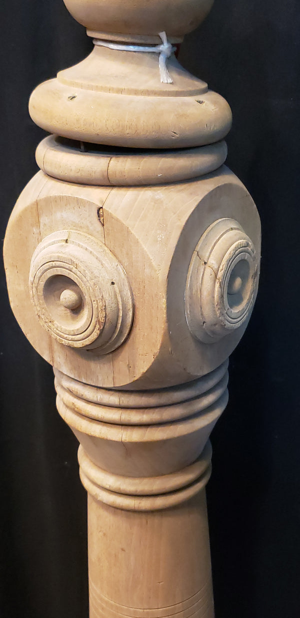 We recently stripped the many layers of paint from this newel post to reveal some beautiful details. The top has a tiered tapered square and directly underneath are round rosettes with button centers.