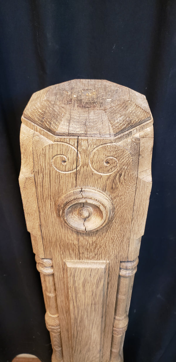 We recently stripped the many layers of paint from this newel post to reveal some incredible details. The top has a smooth octagon shape, each corner has turned spindle accents with top button rosettes surrounded by carvings and each side has a raised panel. Solid oak.