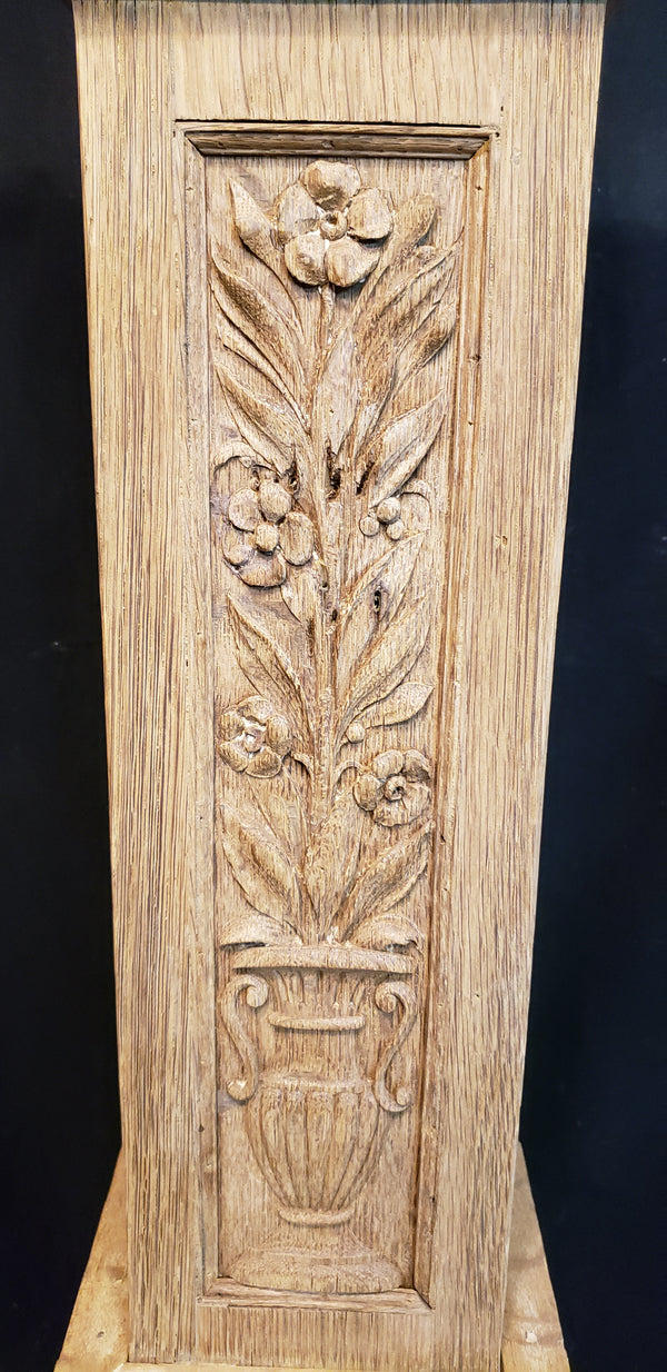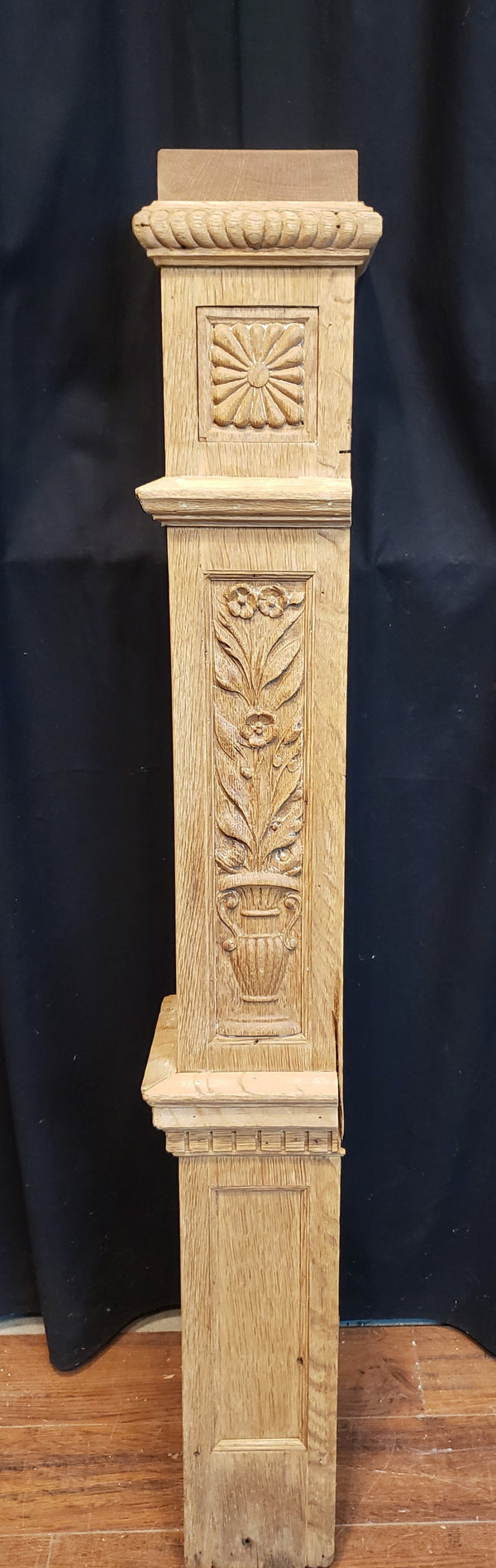 We recently stripped many layers of paint from this newel post to reveal some incredible hand carvings. Each side panel has a stunning Art Nouveau urn and floral design. The top edges have a carved rope design with broad flower petals underneath.