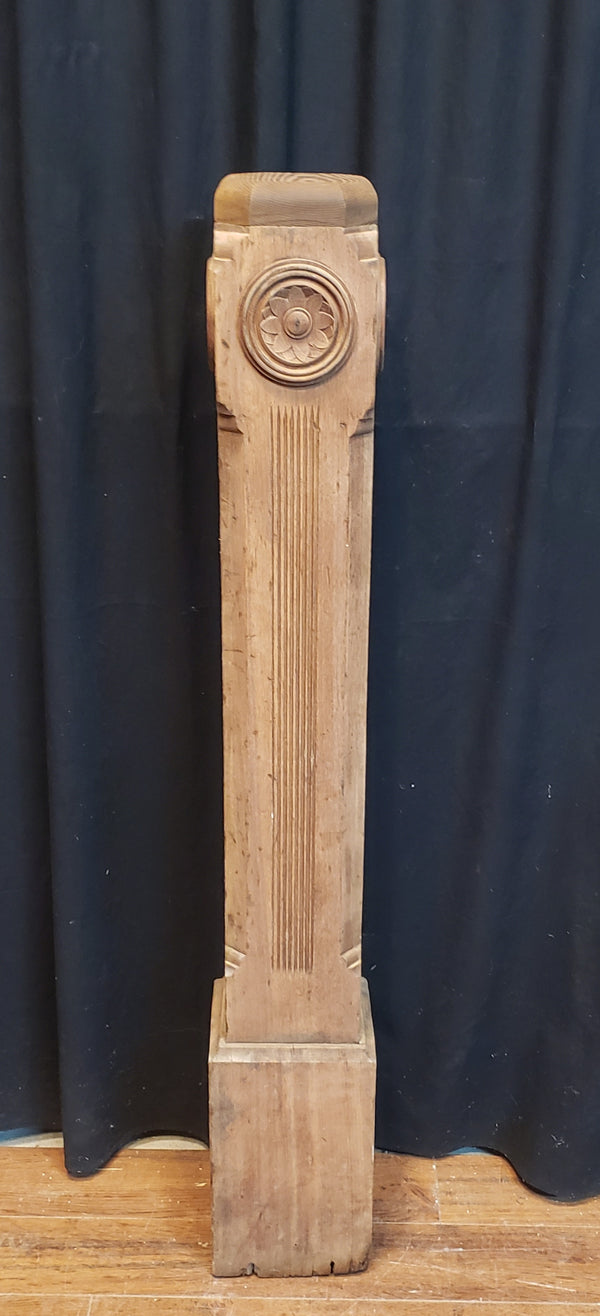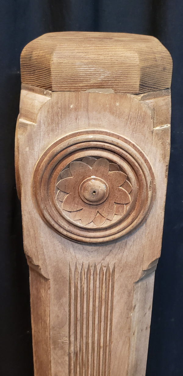 We recently stripped many layers of paint from this newel post to reveal some amazing details. The top has an octagon shape which is tapered. Each side has carved floral rosettes applied and the lower section has deep grooved lines.