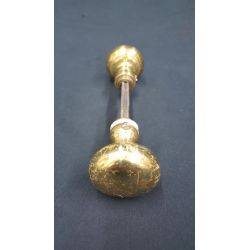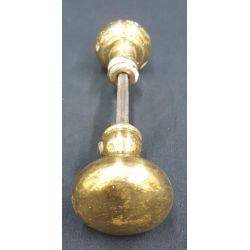 This solid brass door knob set includes 2 knobs, one spindle, and set screws. The knobs are smaller than the average size at 1 3/4" in diameter.  There are light surface scratches seen on both sides.