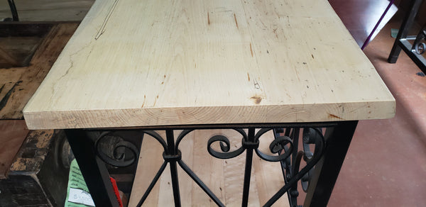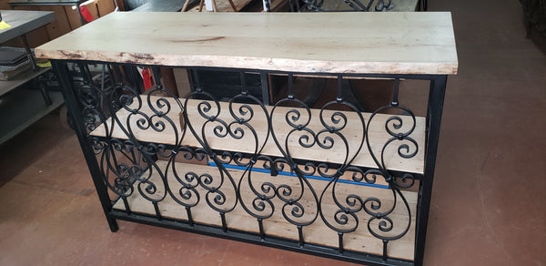 We've created this large table in our shop by using vintage iron and newly sawn wood.  The wood shelves have been clear coated for protection. The top wood shelf is part live edge and smoothed at the front end, which has a number of curves.  The rectangular frame is steel with wrought iron fence sections inside.