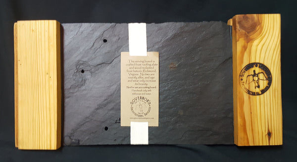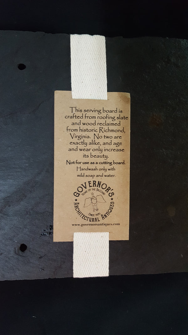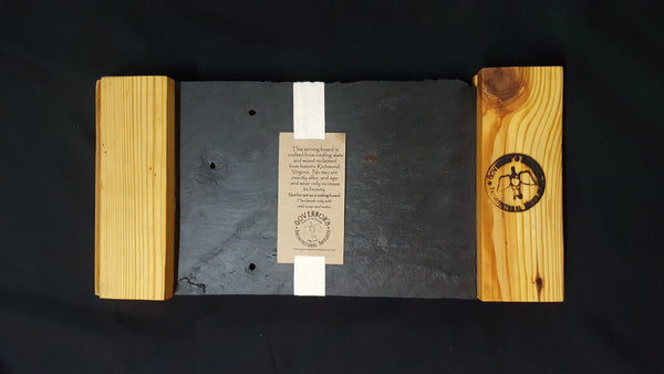 This charcuterie serving board is crafted made from roofing slate and wood reclaimed from historic Richmond, Virginia.  No two are alike.  They make the perfect gift for just about everyone.  You can also chill your board in the refrigerator before or after serving.