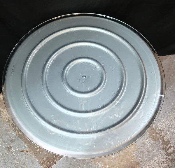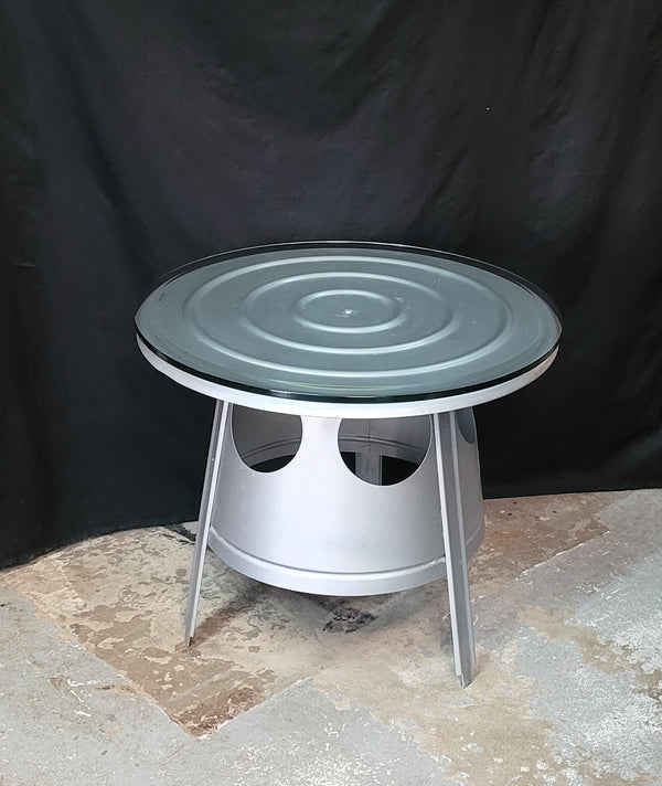 This table was created from a metal feeding container which was on a farm here in Virginia. Cut outs were made on the sides then painted light grey. At the top is a thick tempered beveled glass round that sits just slightly over the metal top.
