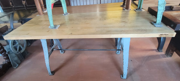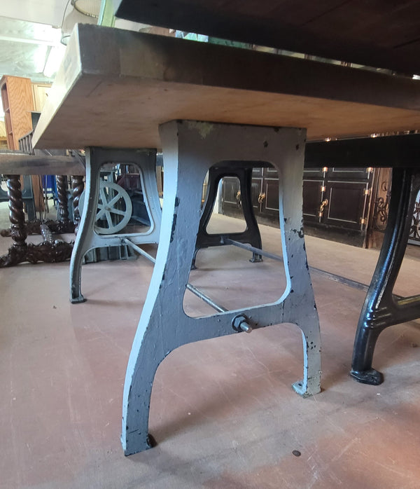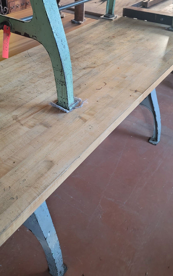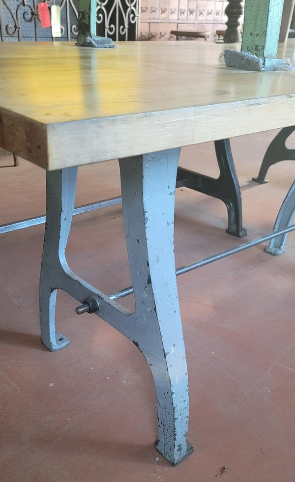 We made this table in our shop from reclaimed butcher block and industrial cast iron machine legs. The wood was clear coated and the legs are their original color of grey/blue.