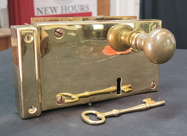 This unique solid brass left side rim lock set has a number of accessories. The set comes with the solid brass rim lock, two brass knobs, one center spindle w/ set screws, side keeper, working key, deadbolt cylinder (no key), peek-a-boo brass deadbolt escutcheon reverse rectangular door plate and bolts for installation.