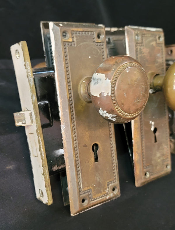 The listing is a pair of matching mortice lock sets. Each set comes with lock box, 2 back plates, 2 door knobs, one spindle and two set screws. Existing finish does have some residual paint (shown). Made of brass with a geometric beaded design which matches the backplates and knobs.