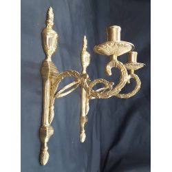 These are very pretty and ornate solid brass candle sconces with top torch (flame) designs and a large ring accent. Excellent condition and made in Sweden. Each sconce measures 12" inches tall 2" inches wide with a 7" inch projection.