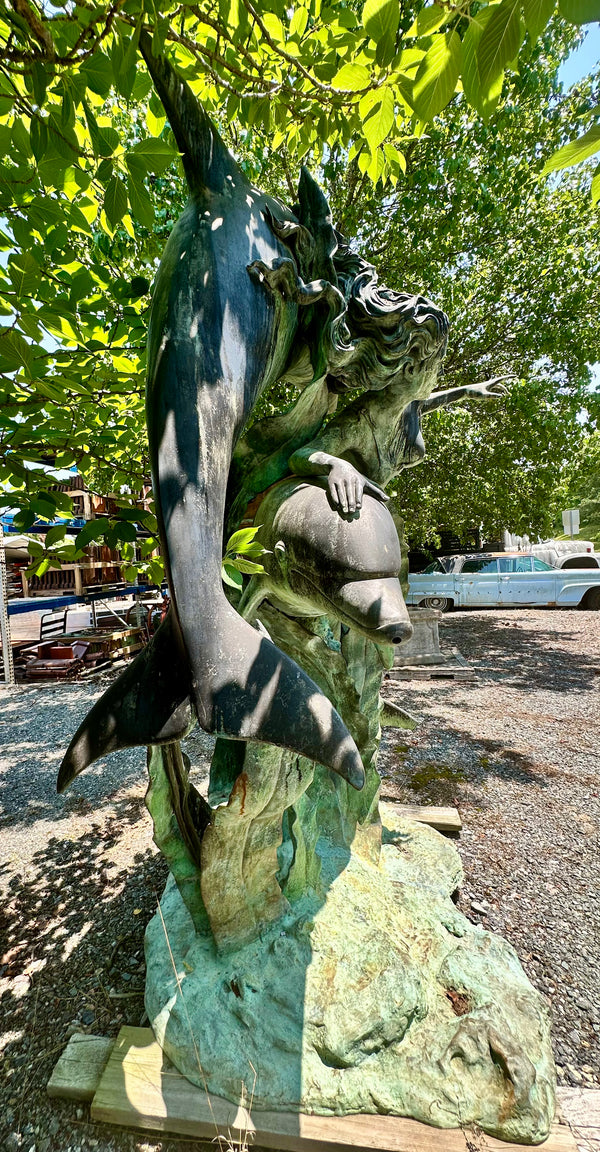 This bronze sculpture features a woman swimming with dolphins, showcasing a graceful and elegant design. Crafted from high-quality bronze, the sculpture captures a serene and fluid movement that is sure to mesmerize viewers.
