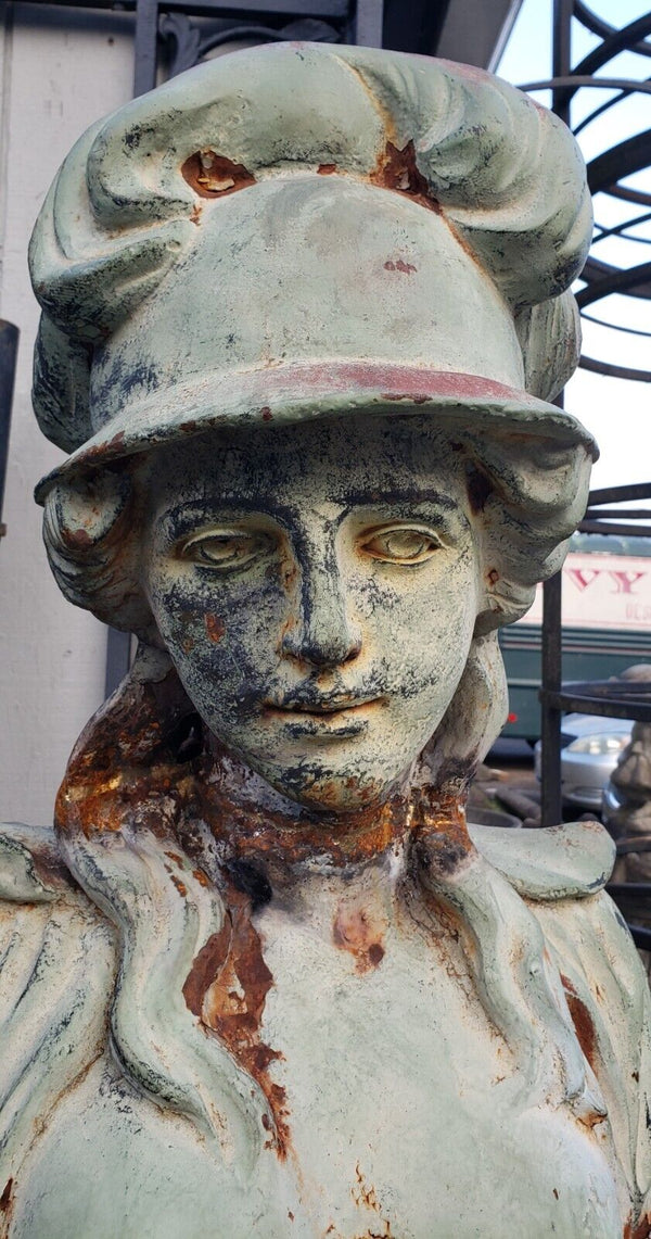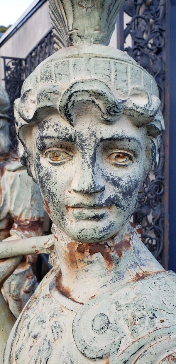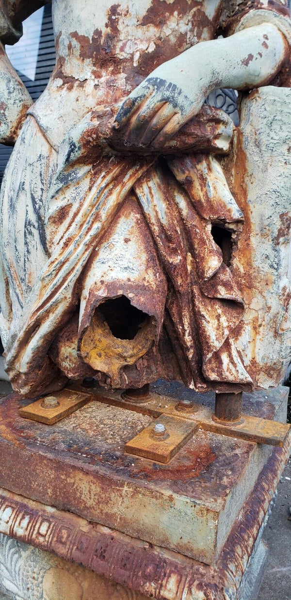 These statues were created from cast iron and recently acquired from an estate sale in Virginia. These statues were previously life size but due to recent damage we salvaged the pair with some TLC and bolted both of them on 20" by 20" by 12" cast iron pedestals that just happen to match very well.